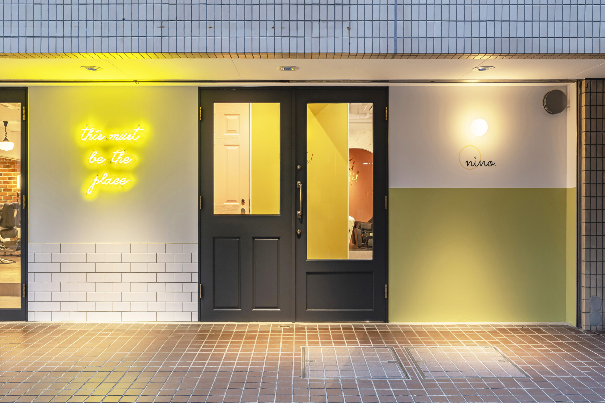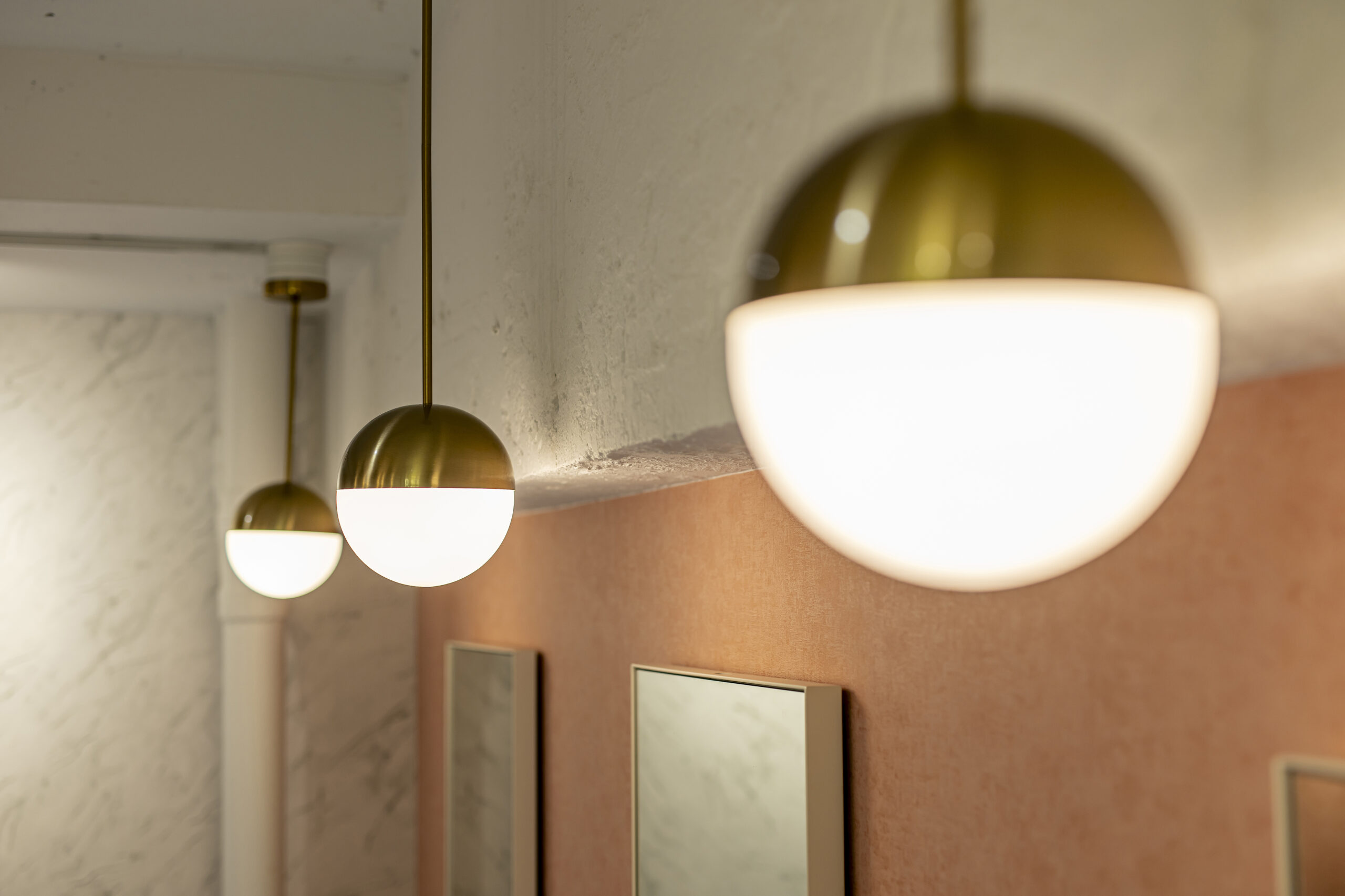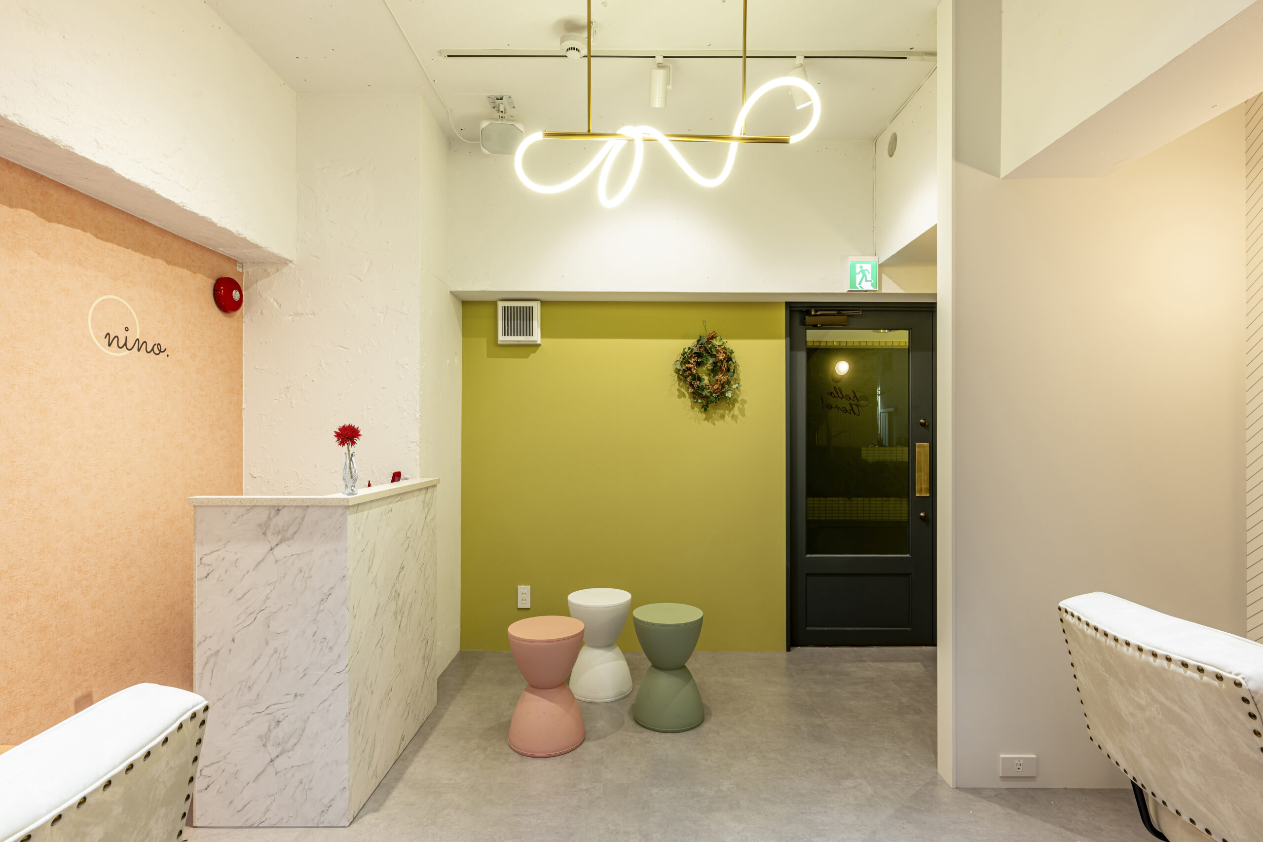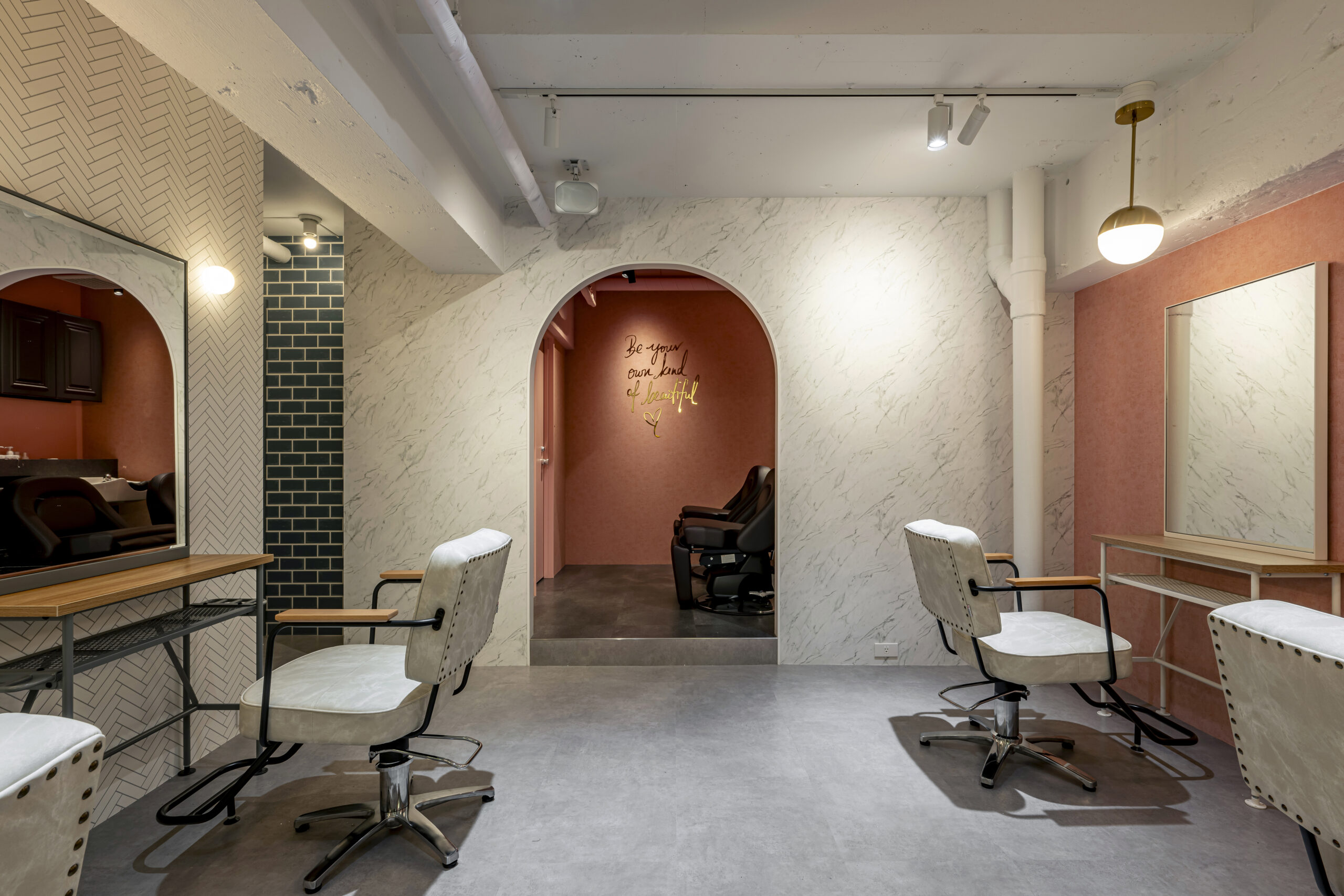 フェミニンモダンをテーマにした大人可愛いテイスト のサロン。可愛らしいサーモンピンクとライトグリー ンの2色の使い分が特徴的。ラグジュアリーな大理石 柄やホワイトへリンボンタイル柄の壁紙、ポイントで 照明に絡んだゴールドをプラスしてエレガントで清潔 感のある空間を演出した。