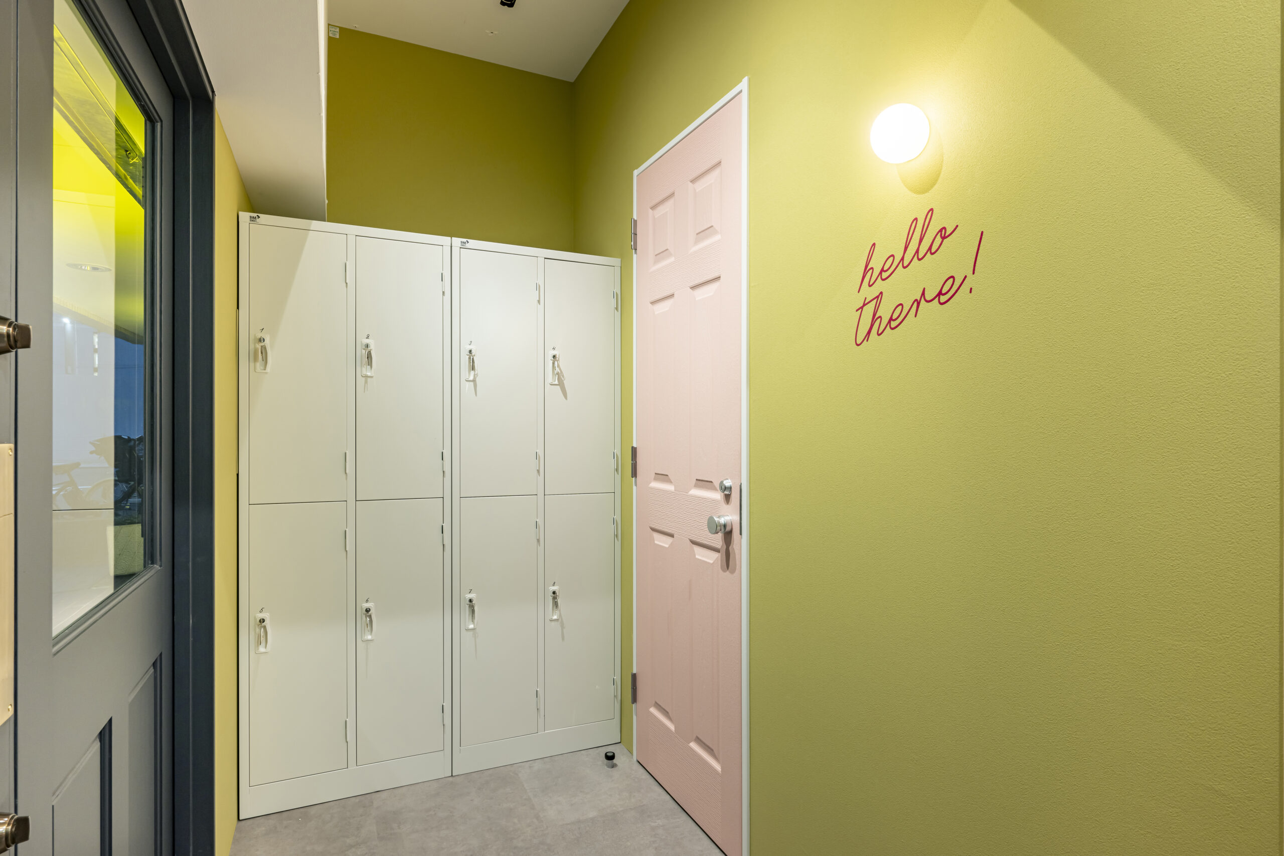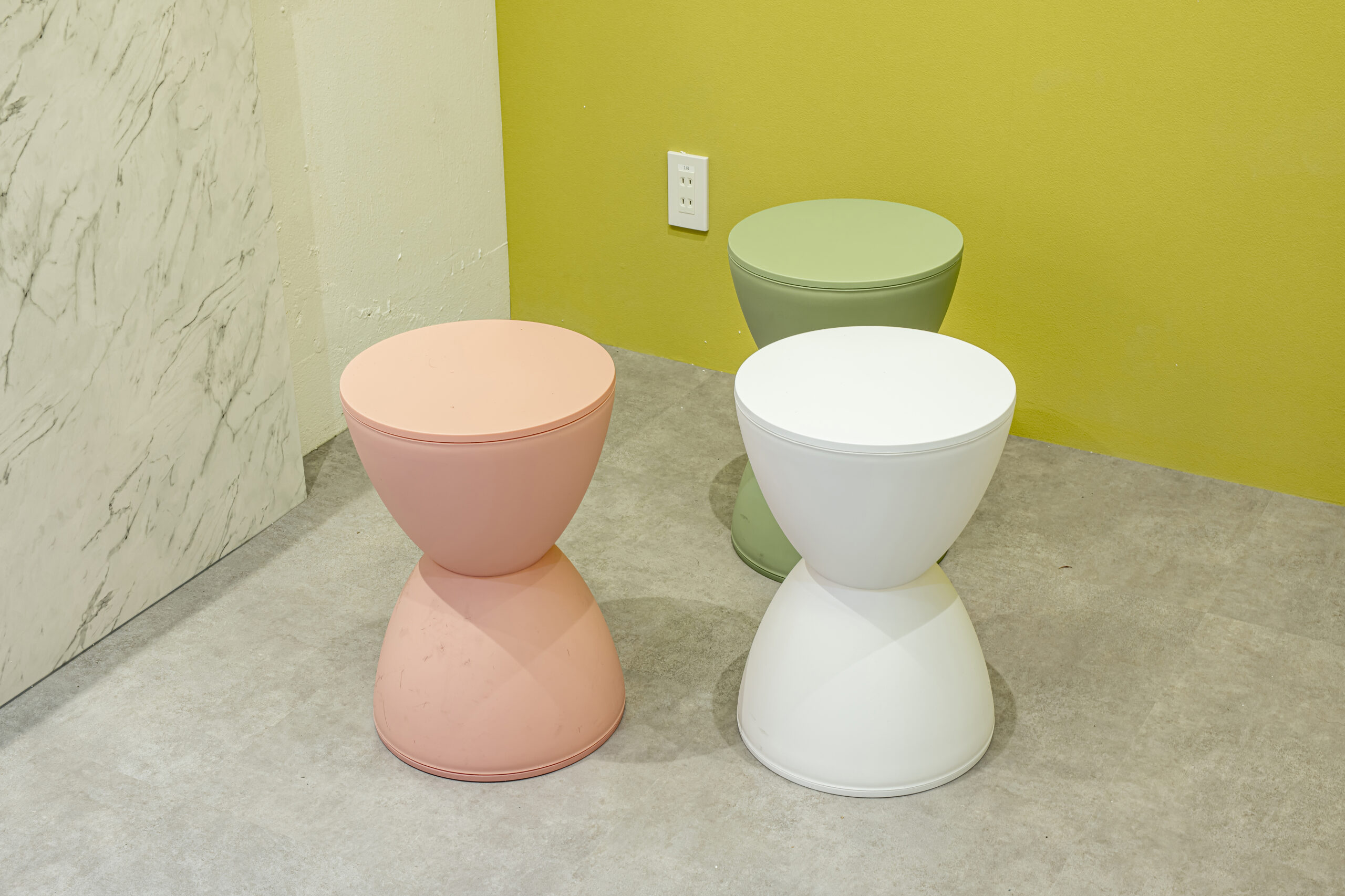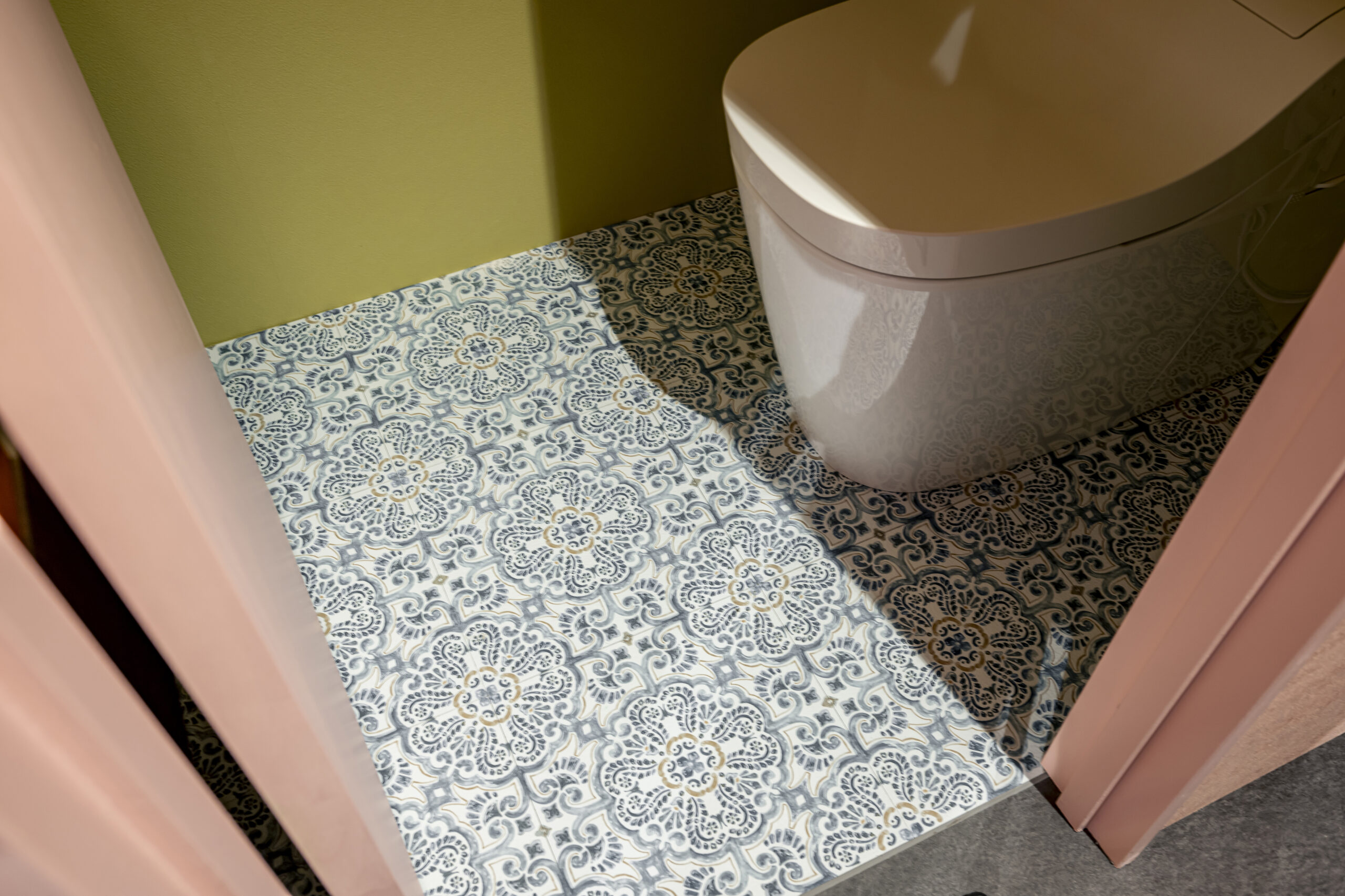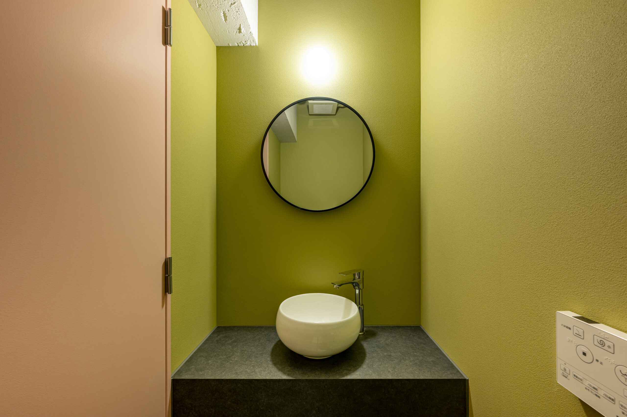 フェミニンモダンをテーマにした大人可愛いテイスト のサロン。可愛らしいサーモンピンクとライトグリー ンの2色の使い分が特徴的。ラグジュアリーな大理石 柄やホワイトへリンボンタイル柄の壁紙、ポイントで 照明に絡んだゴールドをプラスしてエレガントで清潔 感のある空間を演出した。