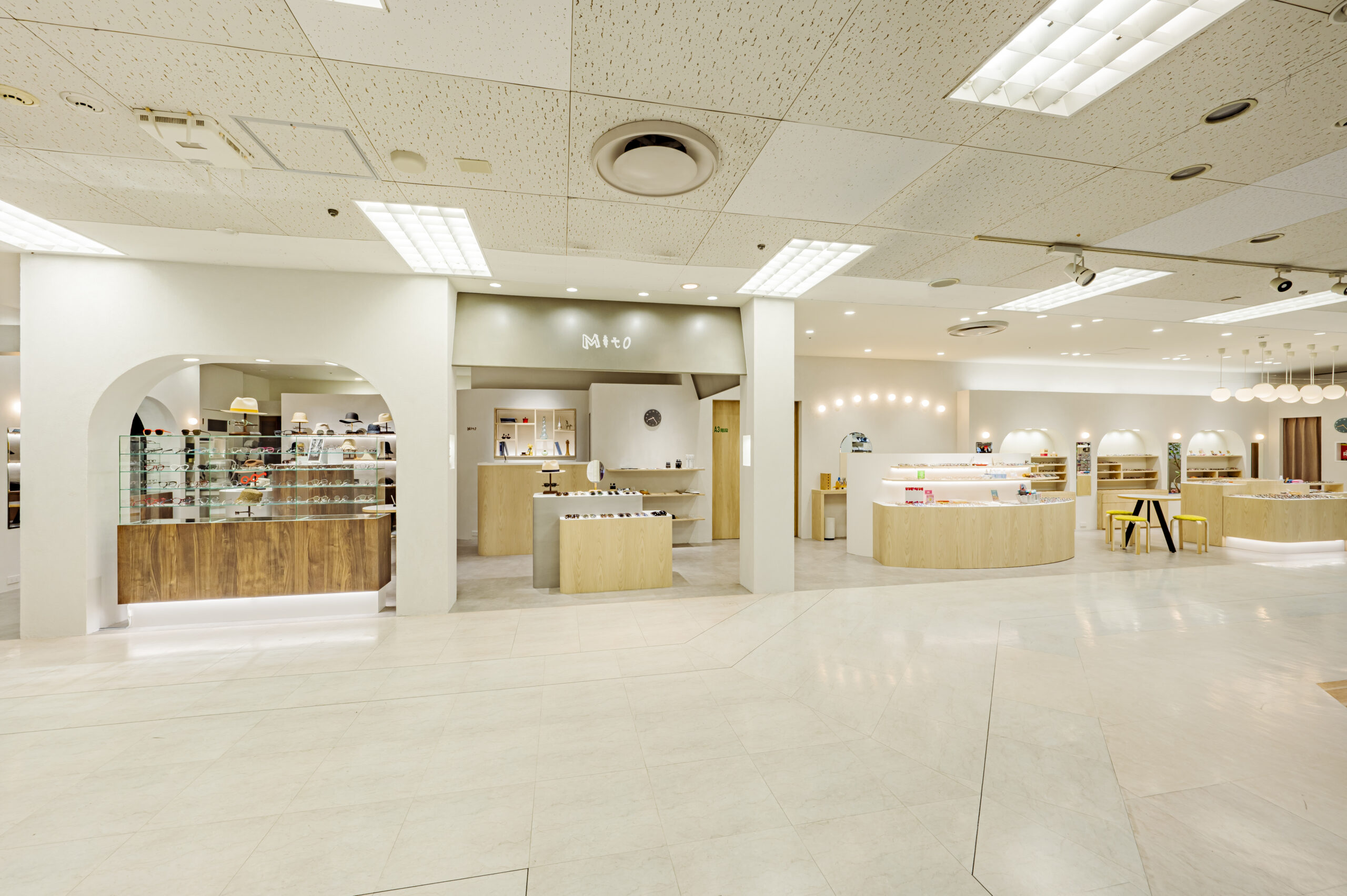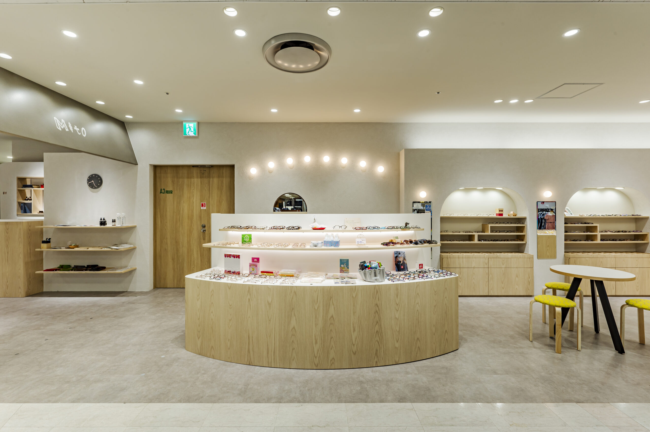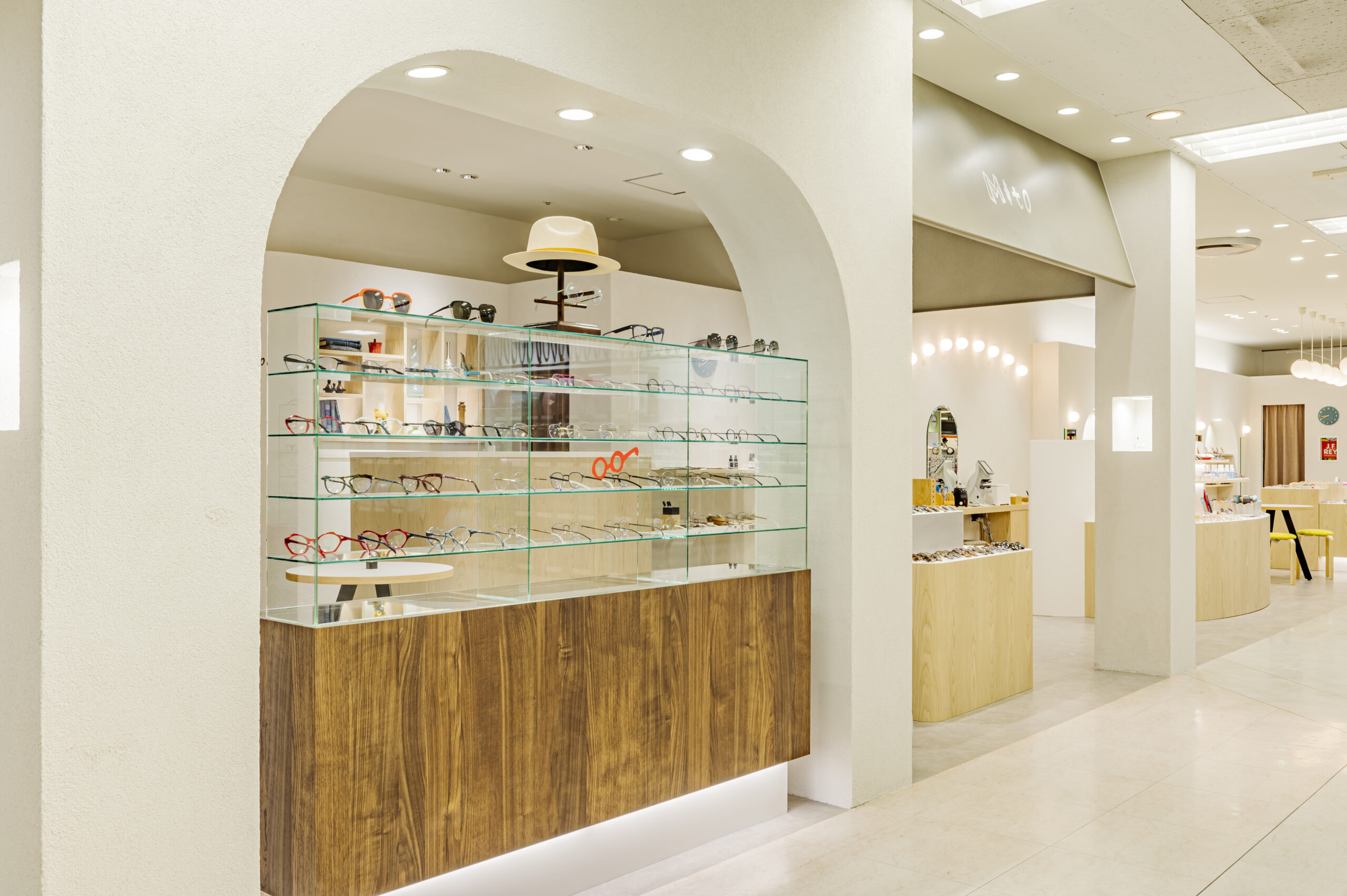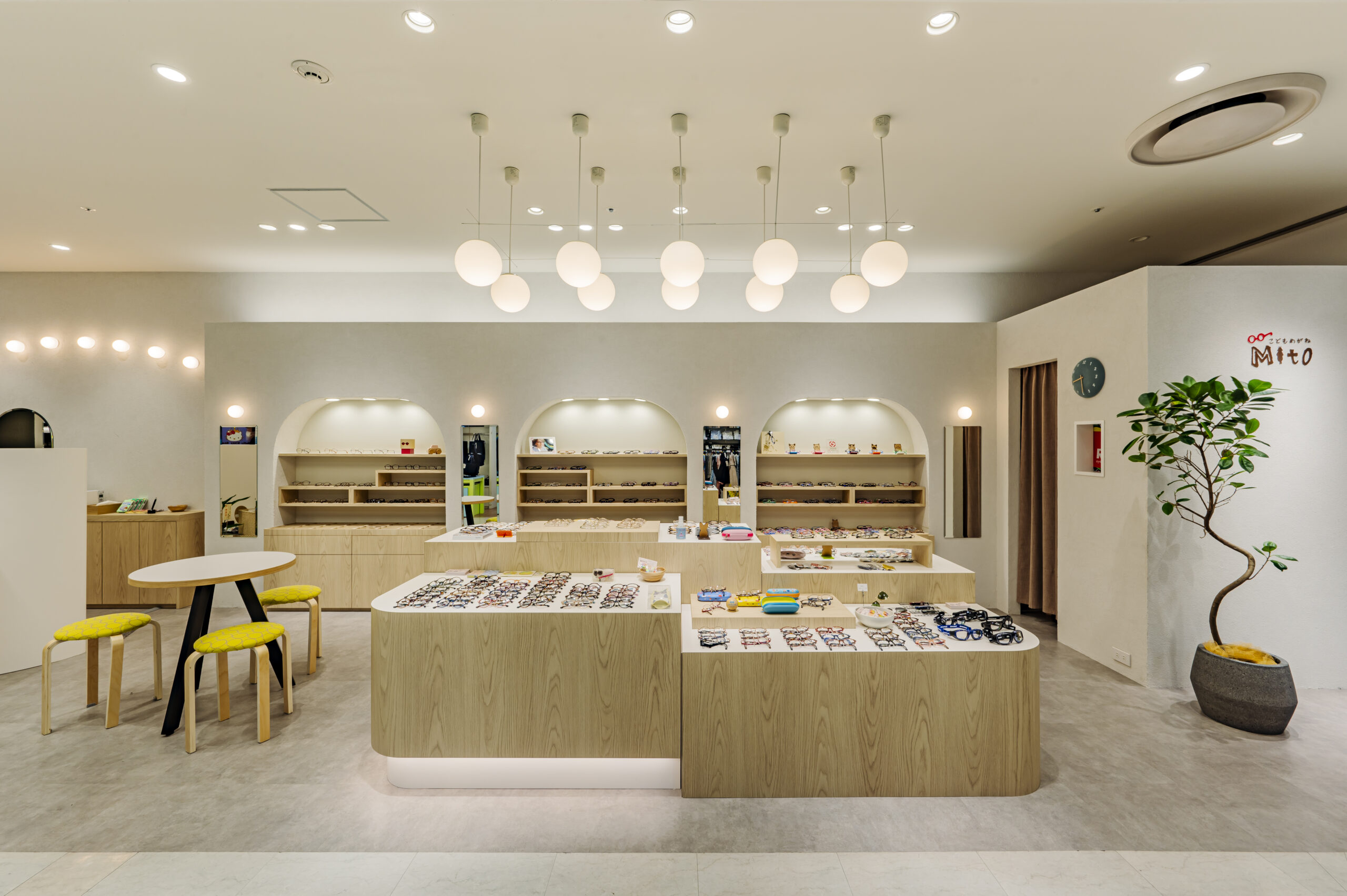 こどもめがね専門店のデザイン。子供の目線で空間を考えワクワク出来るショップを目指した。 ライトオークと左官壁、モルタル床のナチュラル素材を使用したシンプル構成。 丸いブラケットや連続したペンダントで賑やかさを演出し、曲線やアーチを多用した柔らかい空間に仕上げた。 カジュアルな子供ゾーンとテントで区画された落ち着いた大人ゾーンに分かれている。