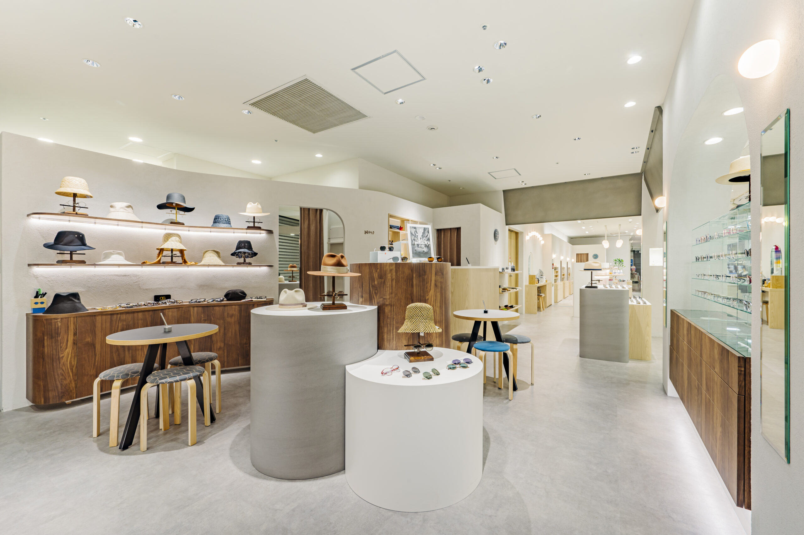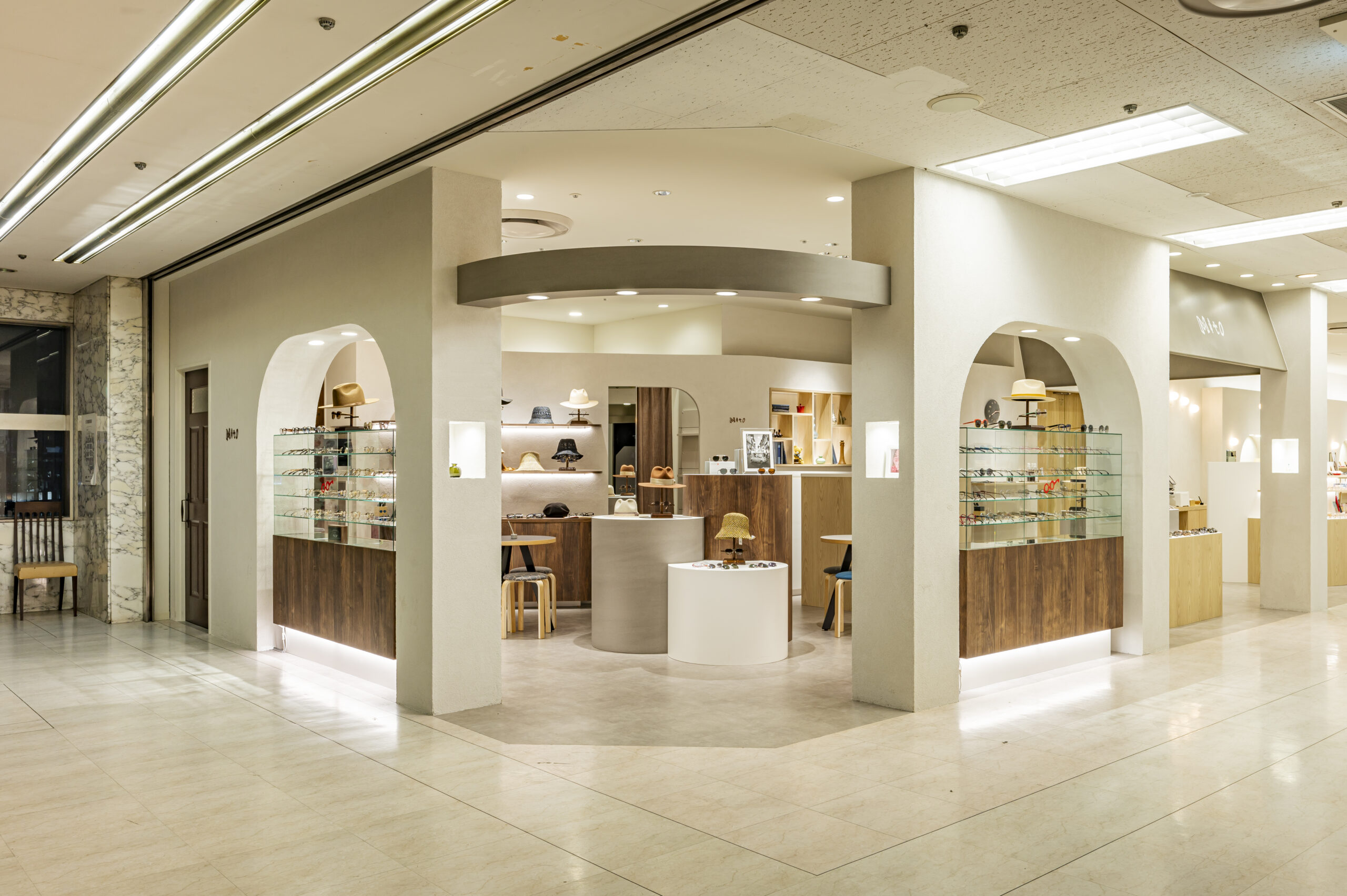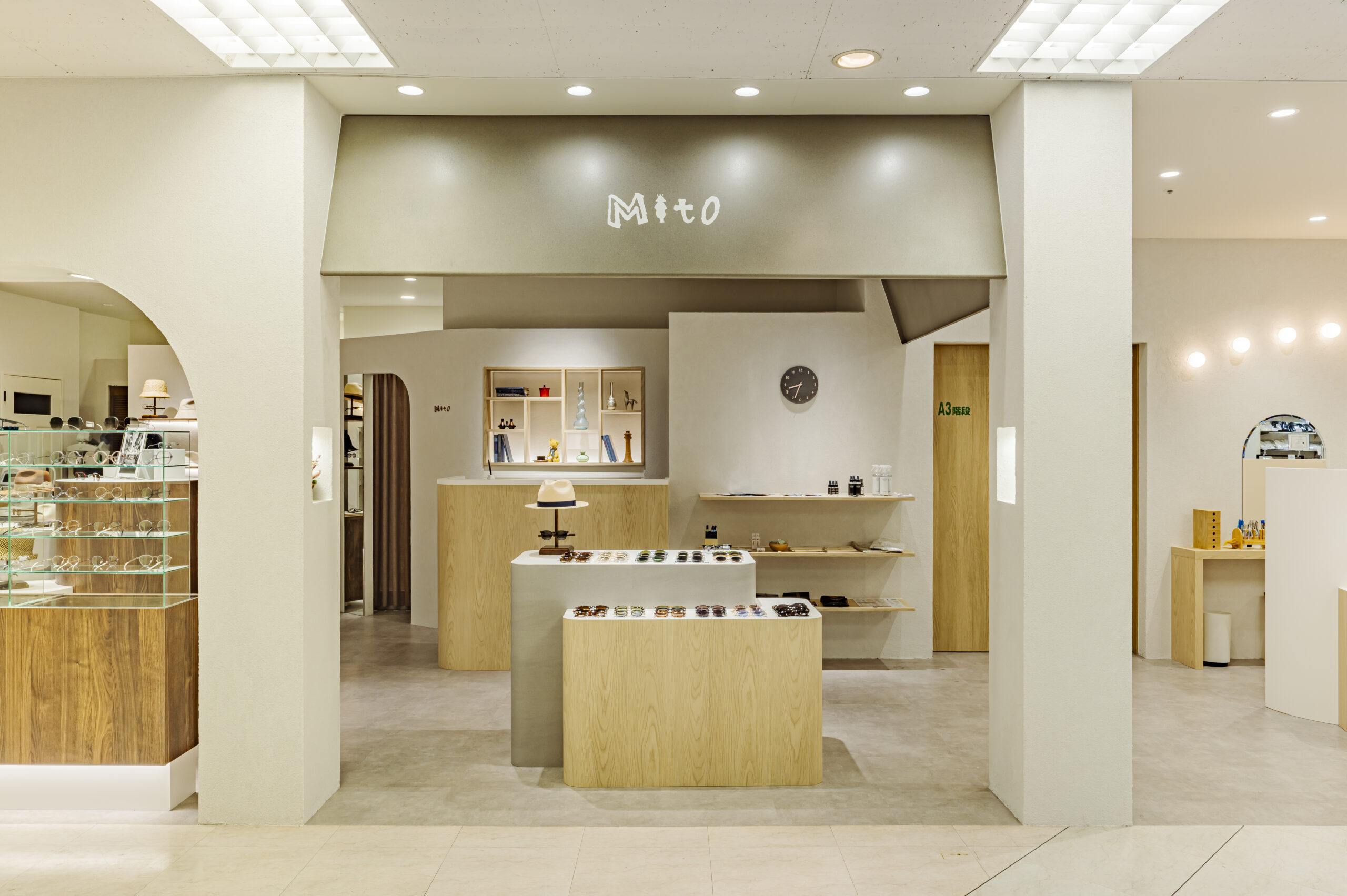こどもめがね専門店のデザイン。子供の目線で空間を考えワクワク出来るショップを目指した。 ライトオークと左官壁、モルタル床のナチュラル素材を使用したシンプル構成。 丸いブラケットや連続したペンダントで賑やかさを演出し、曲線やアーチを多用した柔らかい空間に仕上げた。 カジュアルな子供ゾーンとテントで区画された落ち着いた大人ゾーンに分かれている。