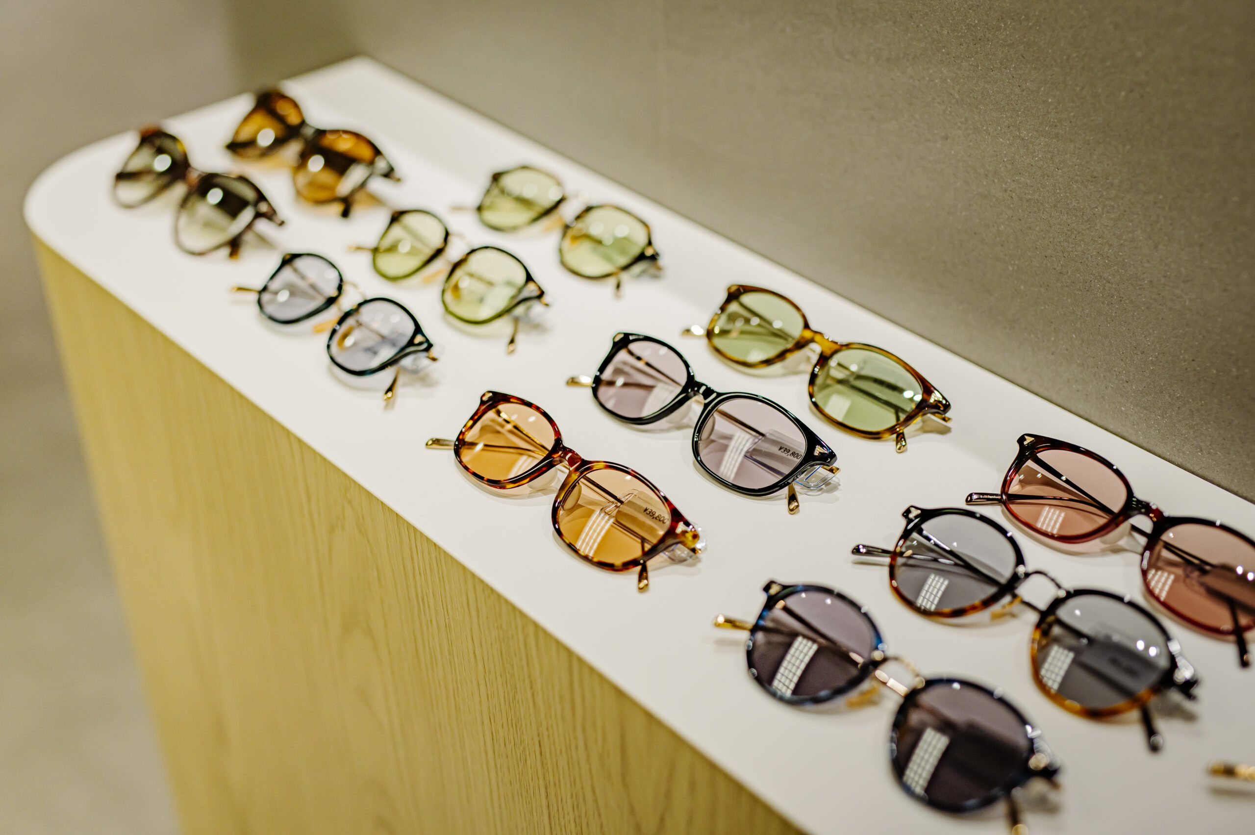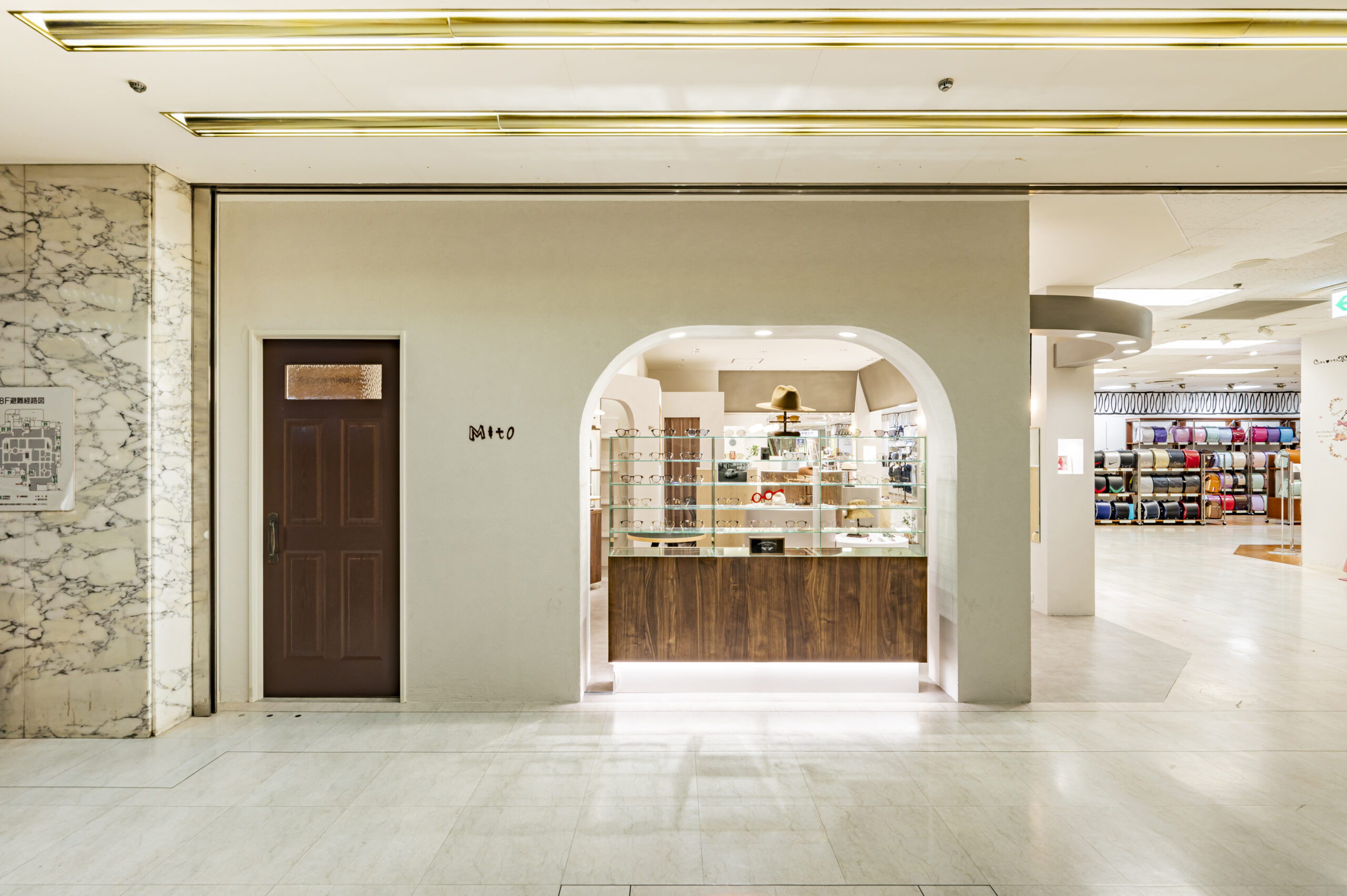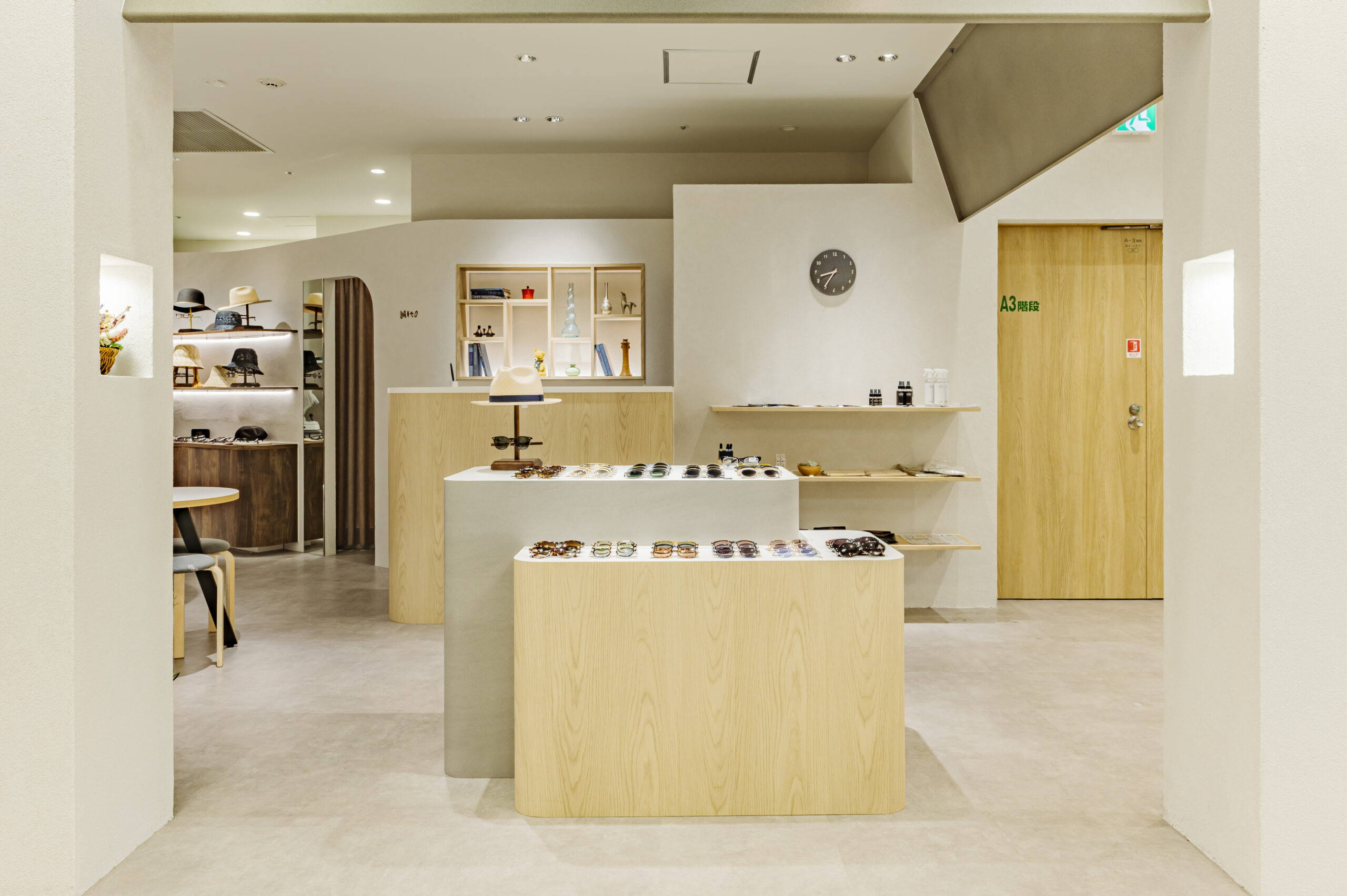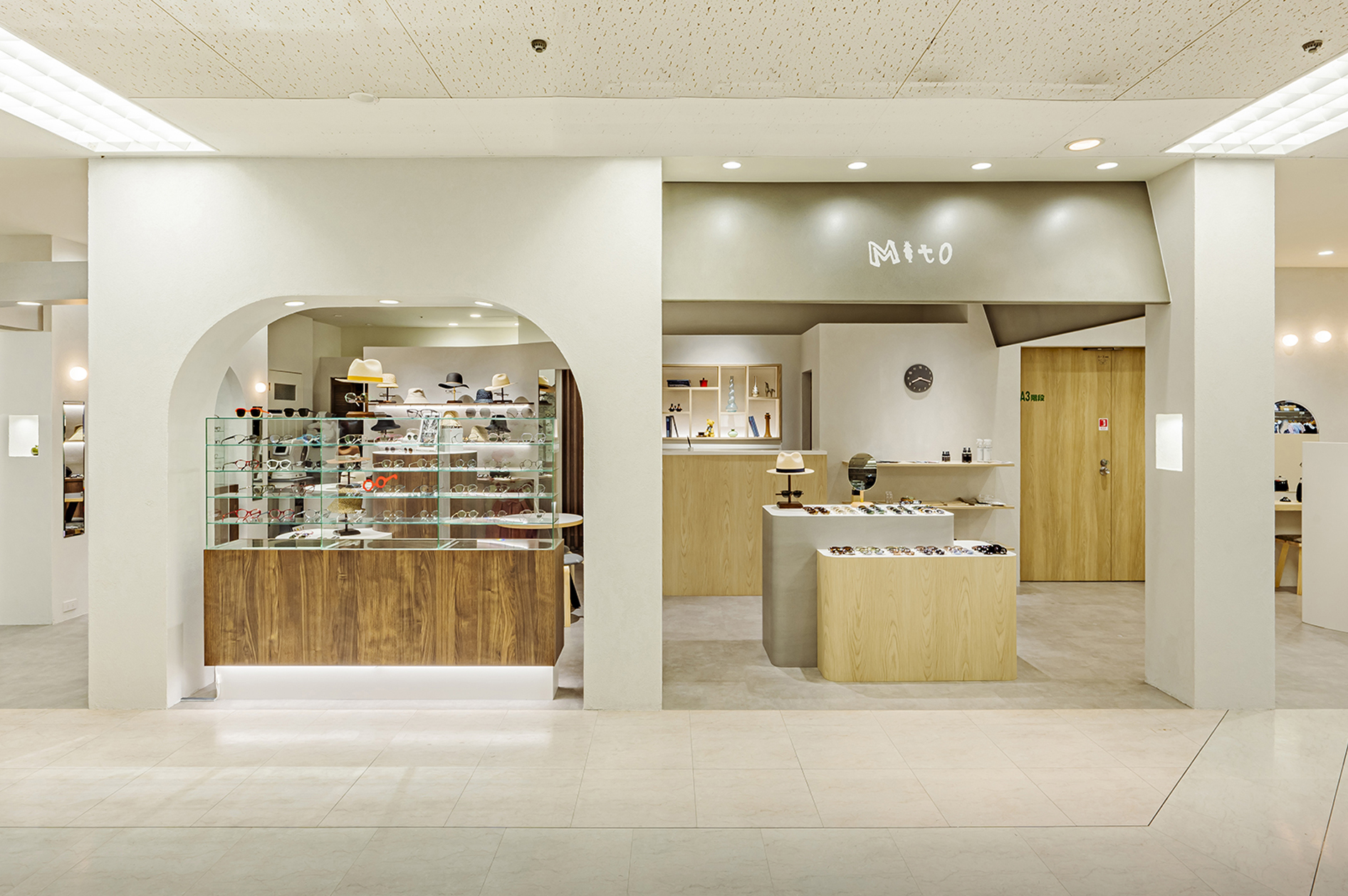 こどもめがね専門店のデザイン。子供の目線で空間を考えワクワク出来るショップを目指した。 ライトオークと左官壁、モルタル床のナチュラル素材を使用したシンプル構成。 丸いブラケットや連続したペンダントで賑やかさを演出し、曲線やアーチを多用した柔らかい空間に仕上げた。 カジュアルな子供ゾーンとテントで区画された落ち着いた大人ゾーンに分かれている。