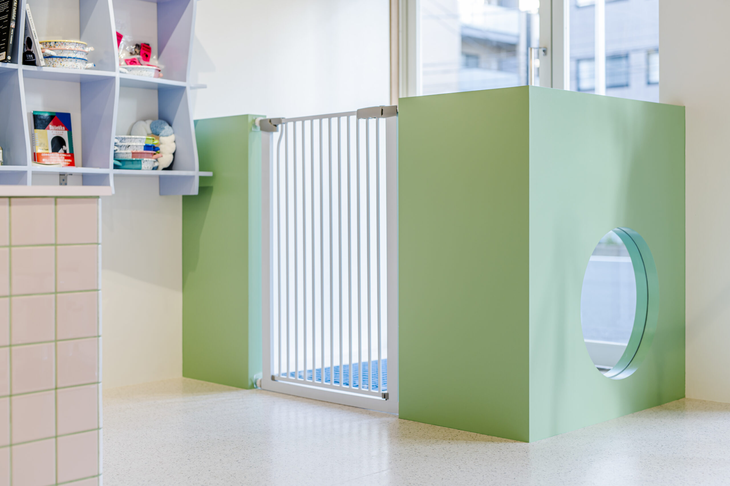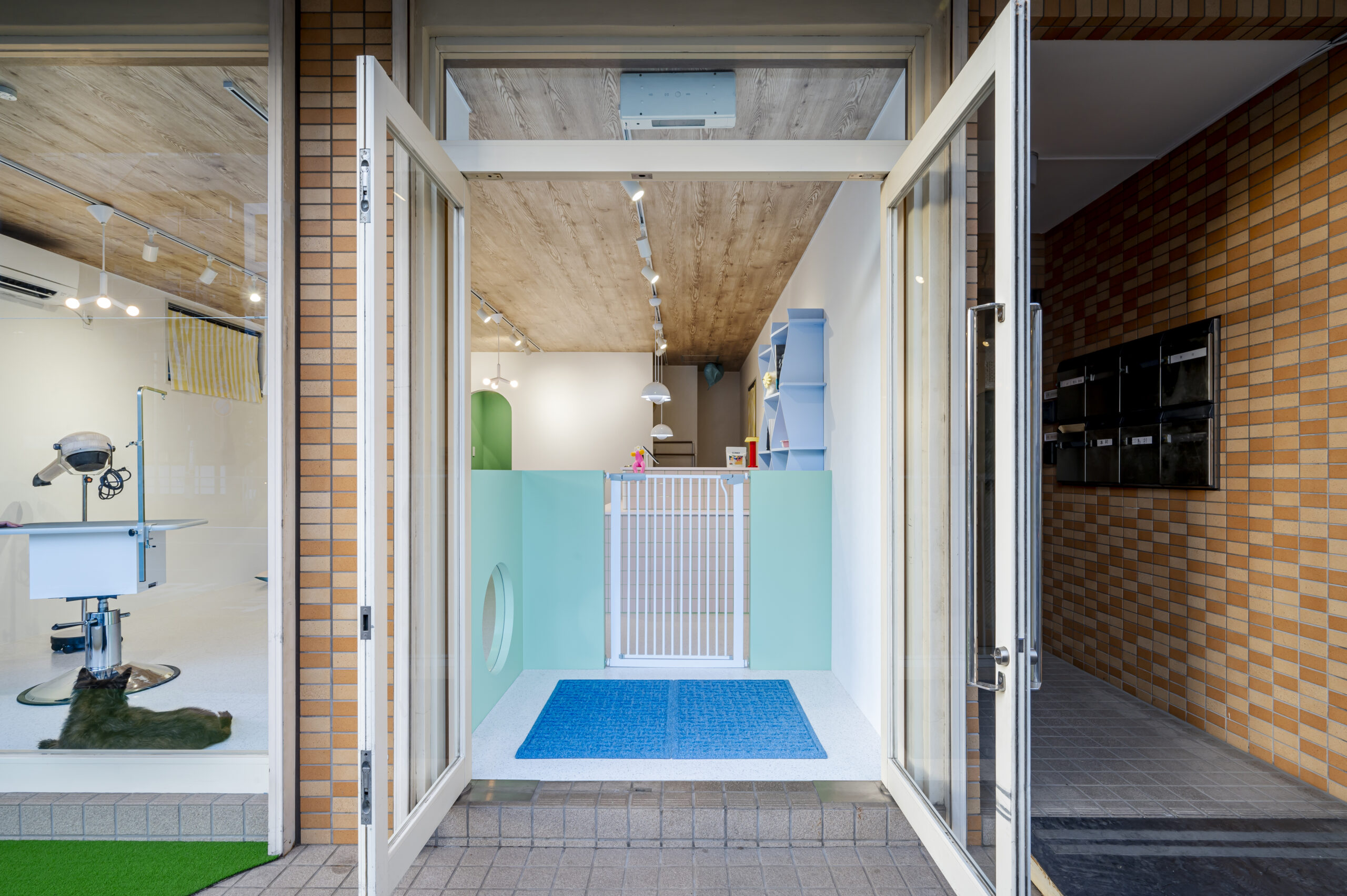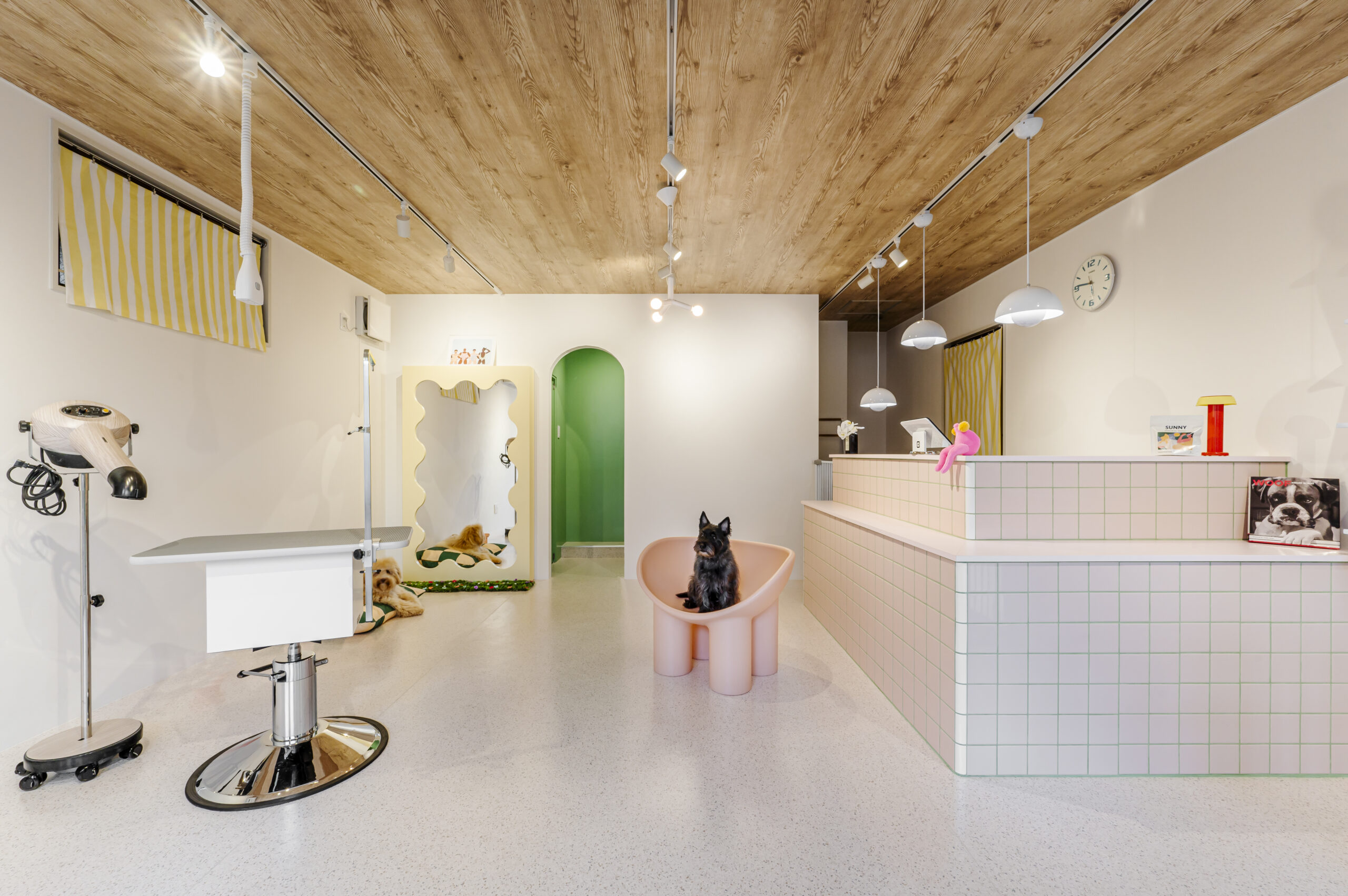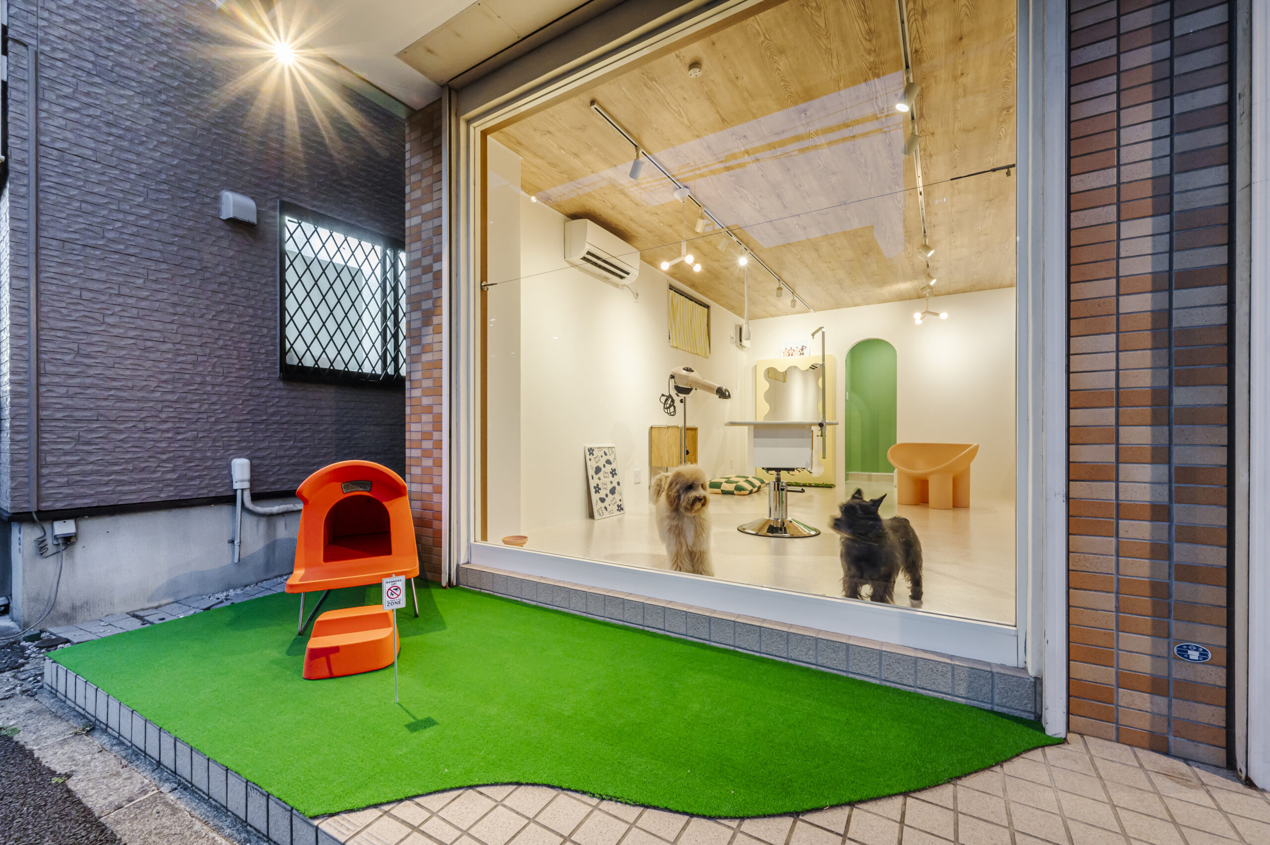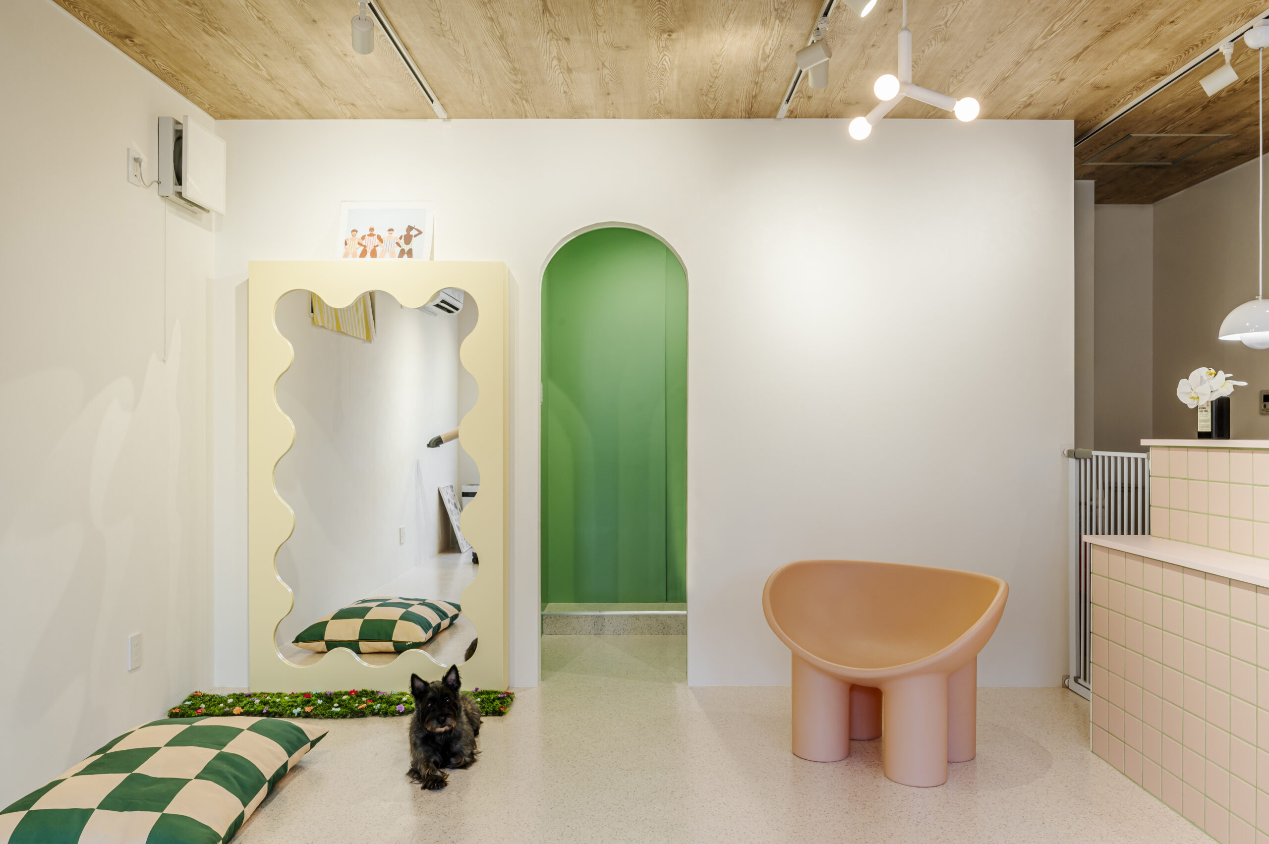 デザイン家具が点在する賑やかなトリミングサロン。 白と木目のシンプルな空間にアーチ開口奥でアクセントカラーのグリーンを使用した奥行きのある空間。 ピンクタイルとグリーン目地のカウンターやケージ用グリーンの腰壁、デザインチェアやミラーなど数種の色をポイントで配置することで可愛らしい空間に仕上がった。ファサードの曲線にカットした芝生の庭と犬小屋も印象的。