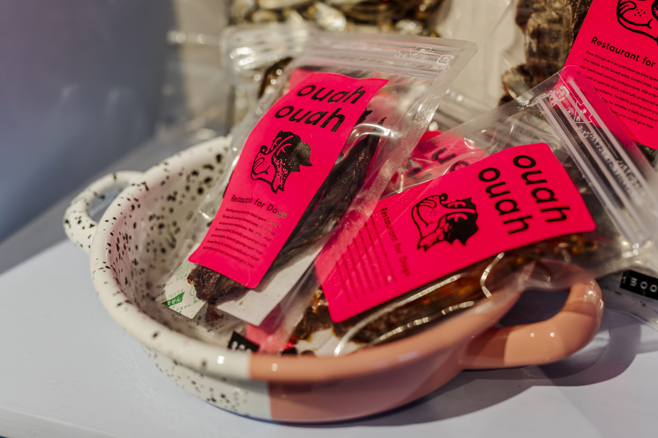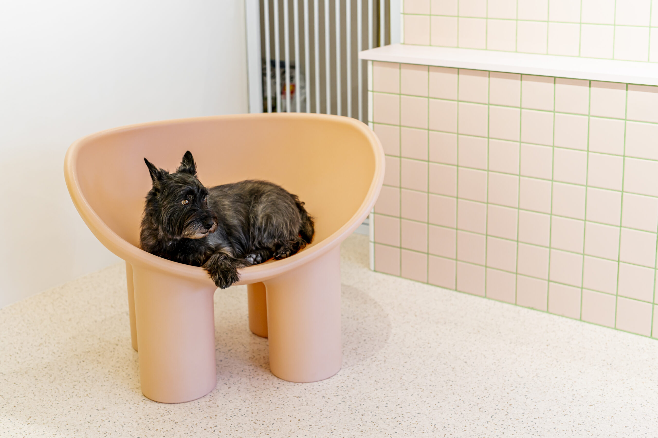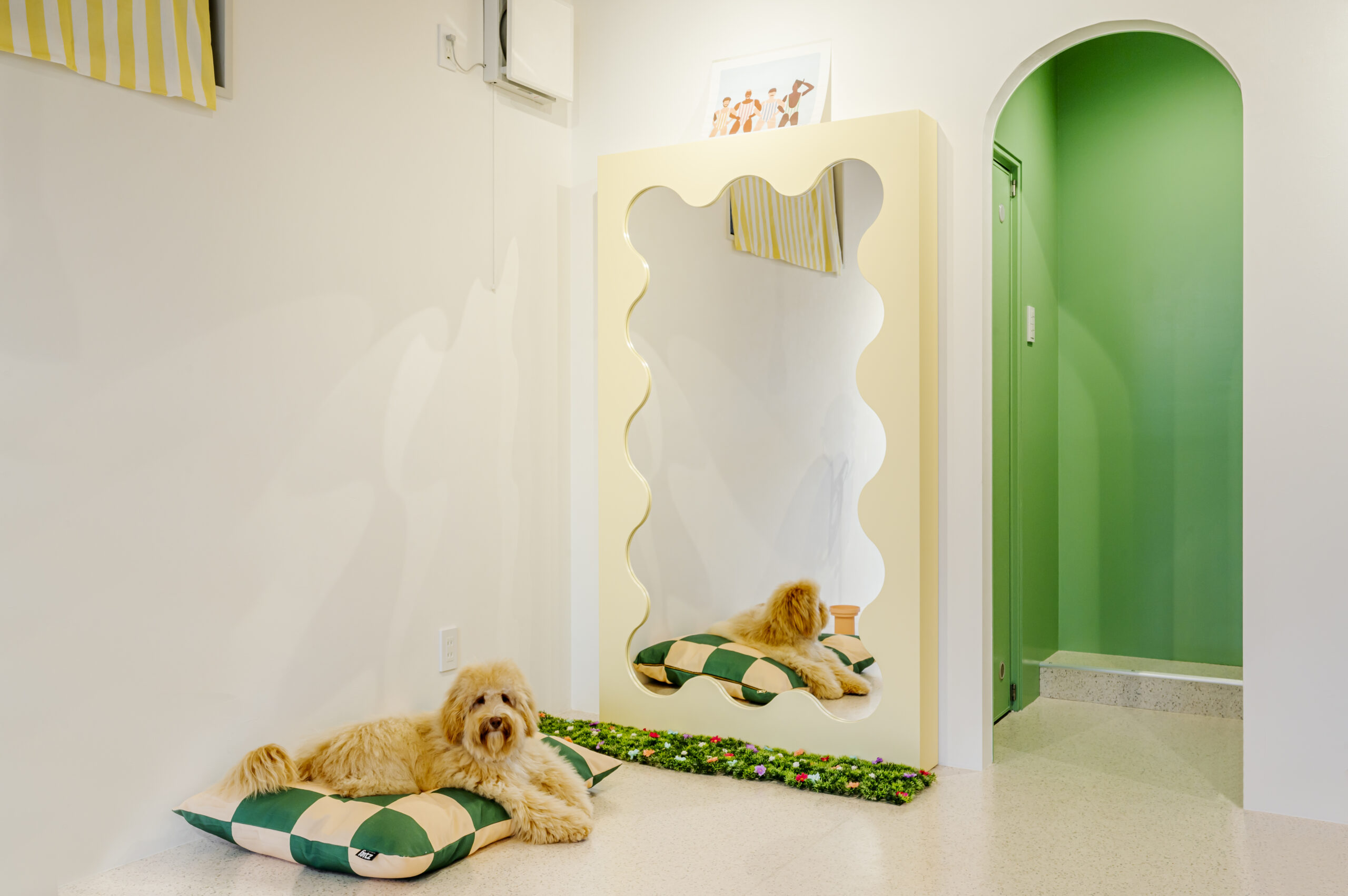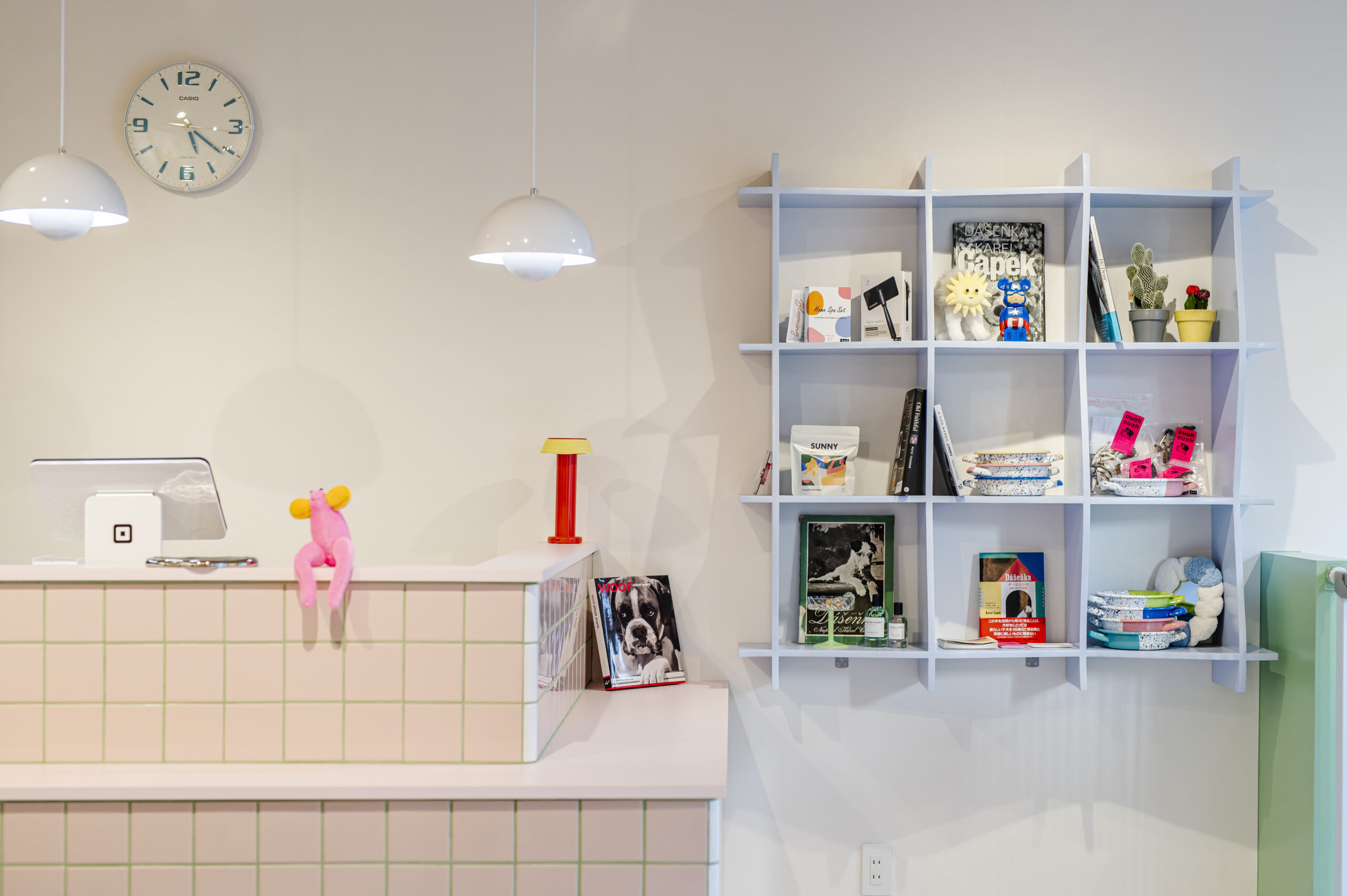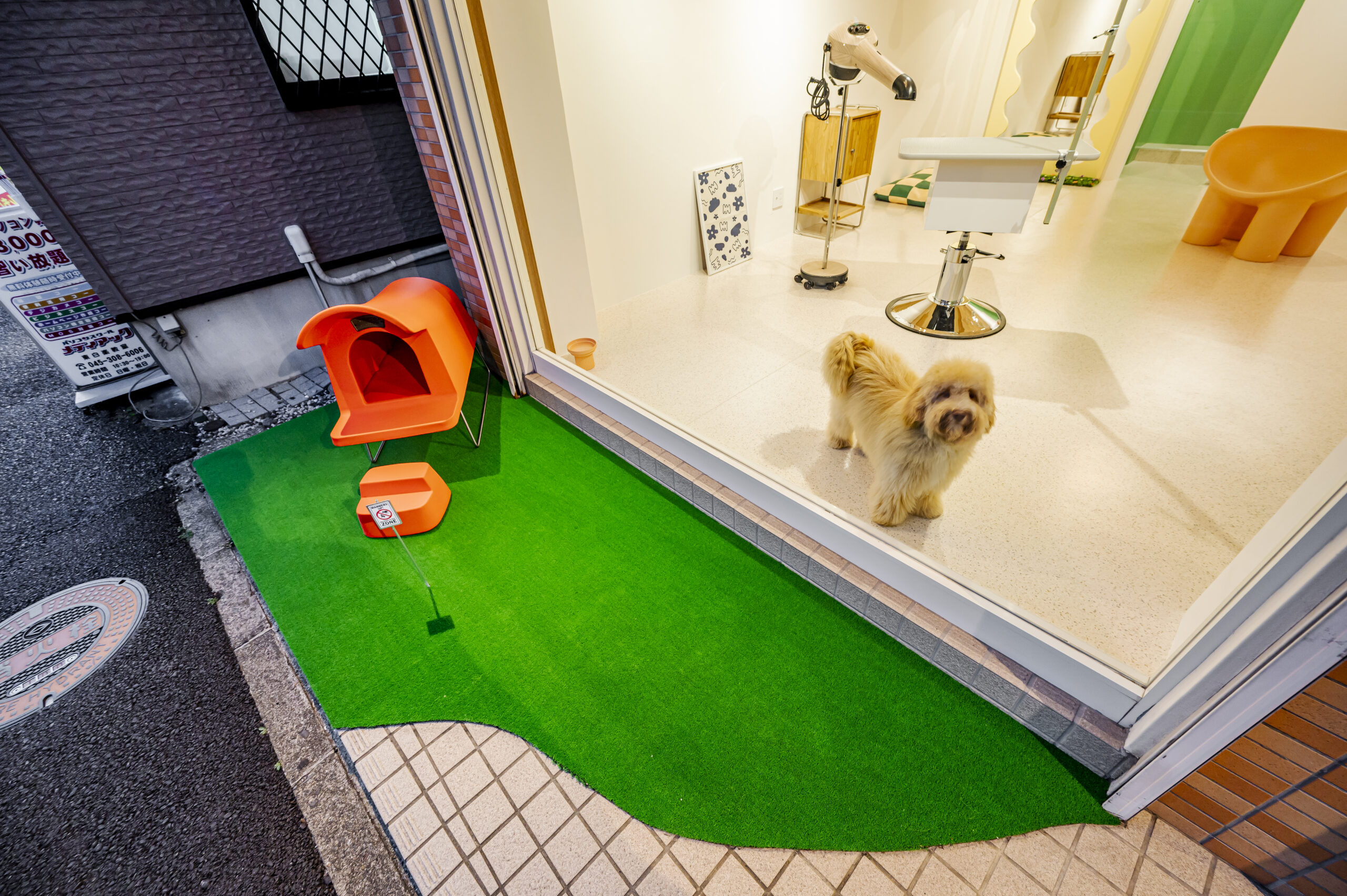 デザイン家具が点在する賑やかなトリミングサロン。 白と木目のシンプルな空間にアーチ開口奥でアクセントカラーのグリーンを使用した奥行きのある空間。 ピンクタイルとグリーン目地のカウンターやケージ用グリーンの腰壁、デザインチェアやミラーなど数種の色をポイントで配置することで可愛らしい空間に仕上がった。ファサードの曲線にカットした芝生の庭と犬小屋も印象的。