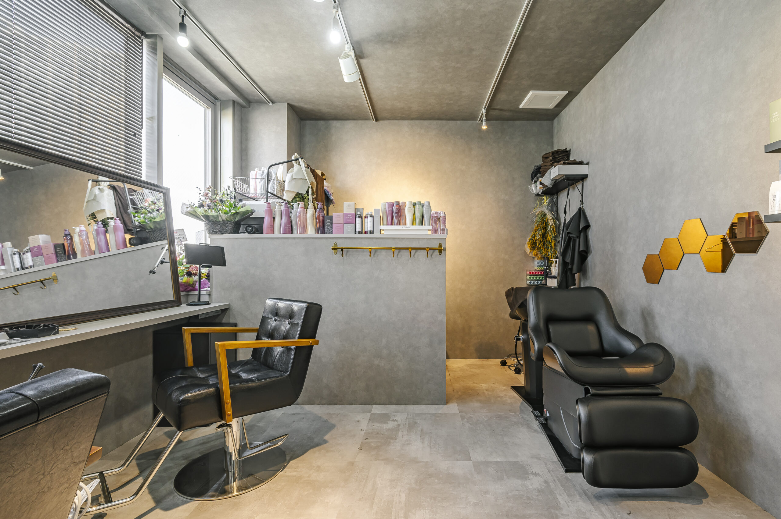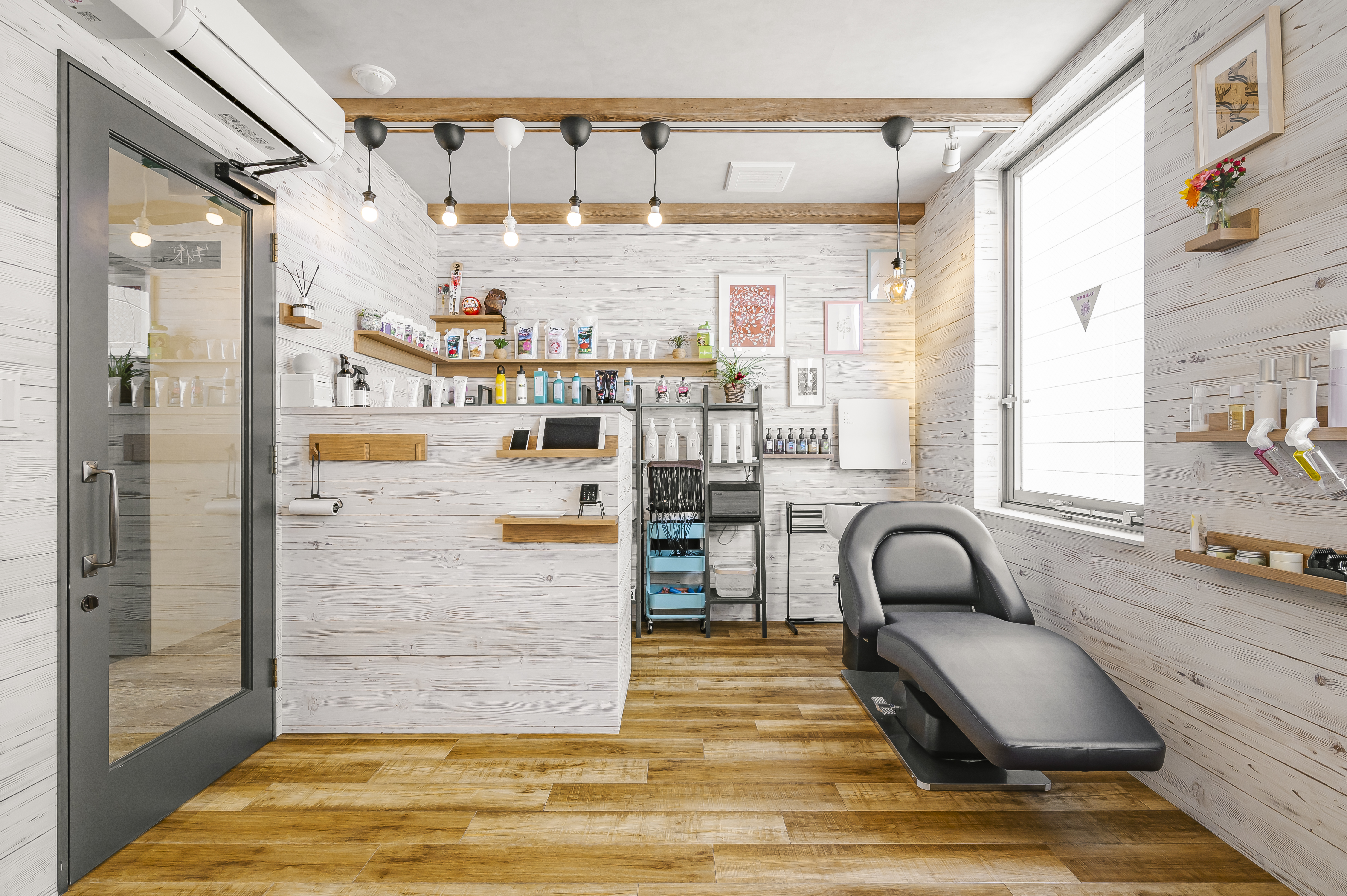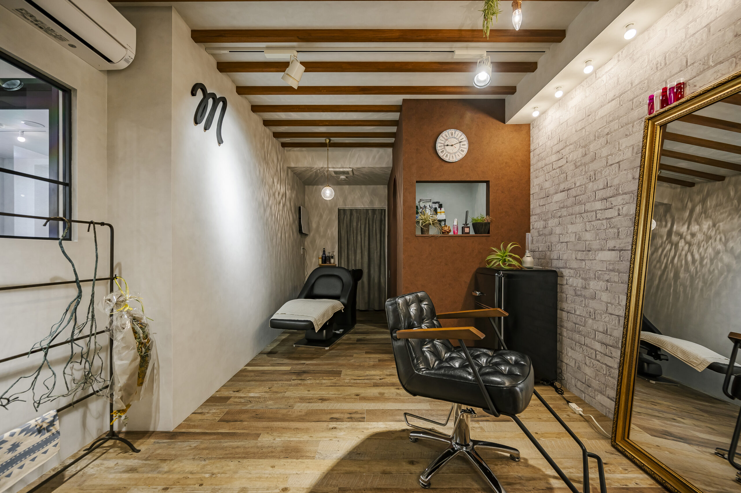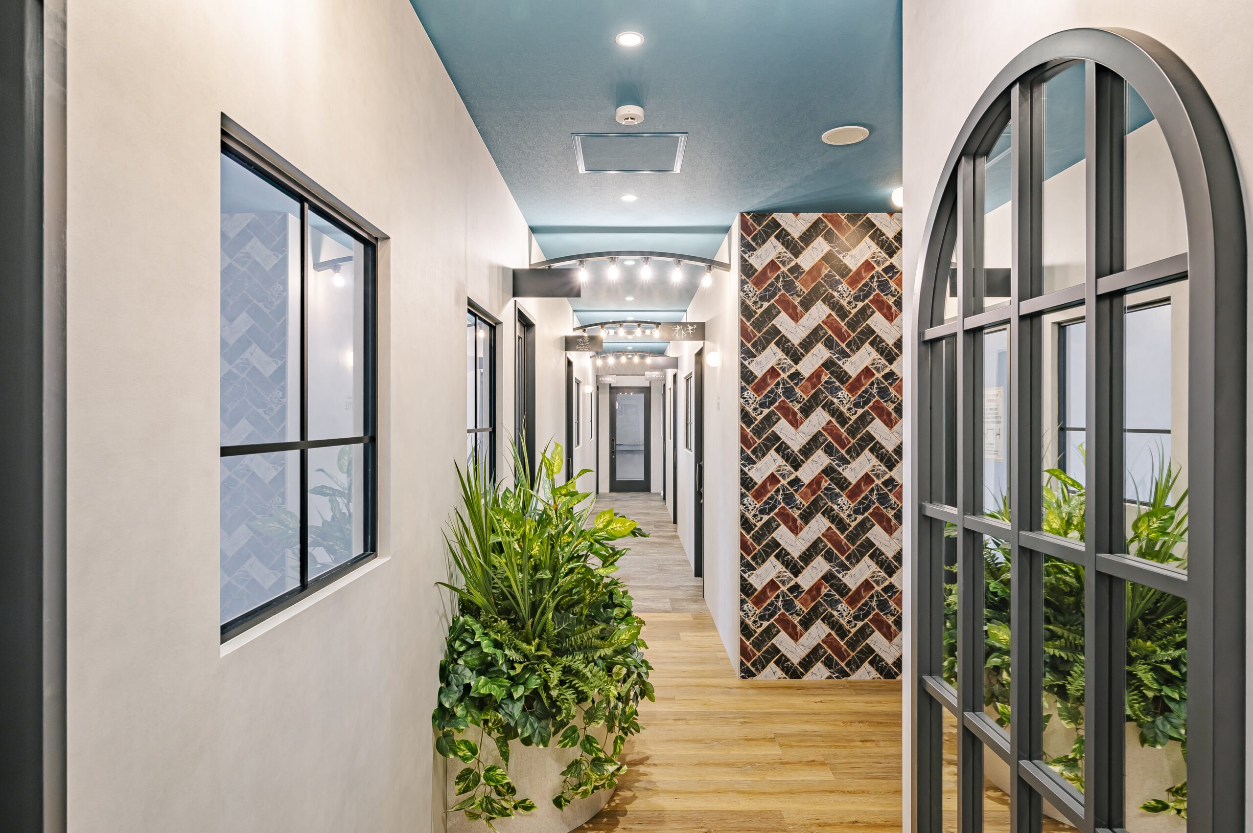 モノトーンで構成されたNYをイメージしたトータルビューティーのオーナーズサロン。 エントランスは大柄のゴシックパターンの床と可愛いロゴのモダンな空間。 屋外をイメージしたブルーの天井は店内奥まで続いており、4本の連続したアーチ照明により リズミカルで開放感のあるアプローチになっている。 中央に配置したランドリーとトイレはどの部屋からもアクセスの良いレイアウト。
