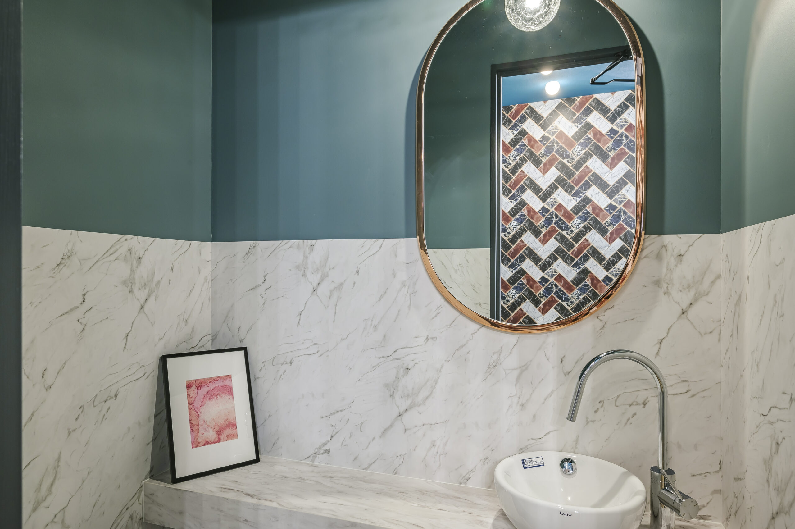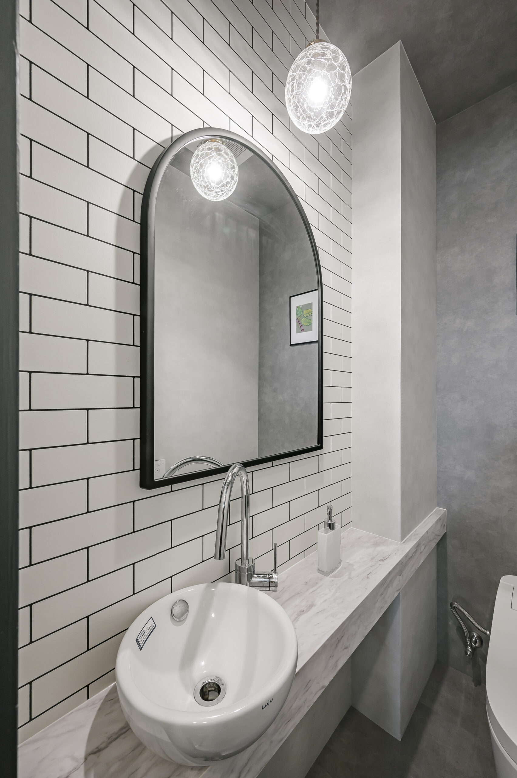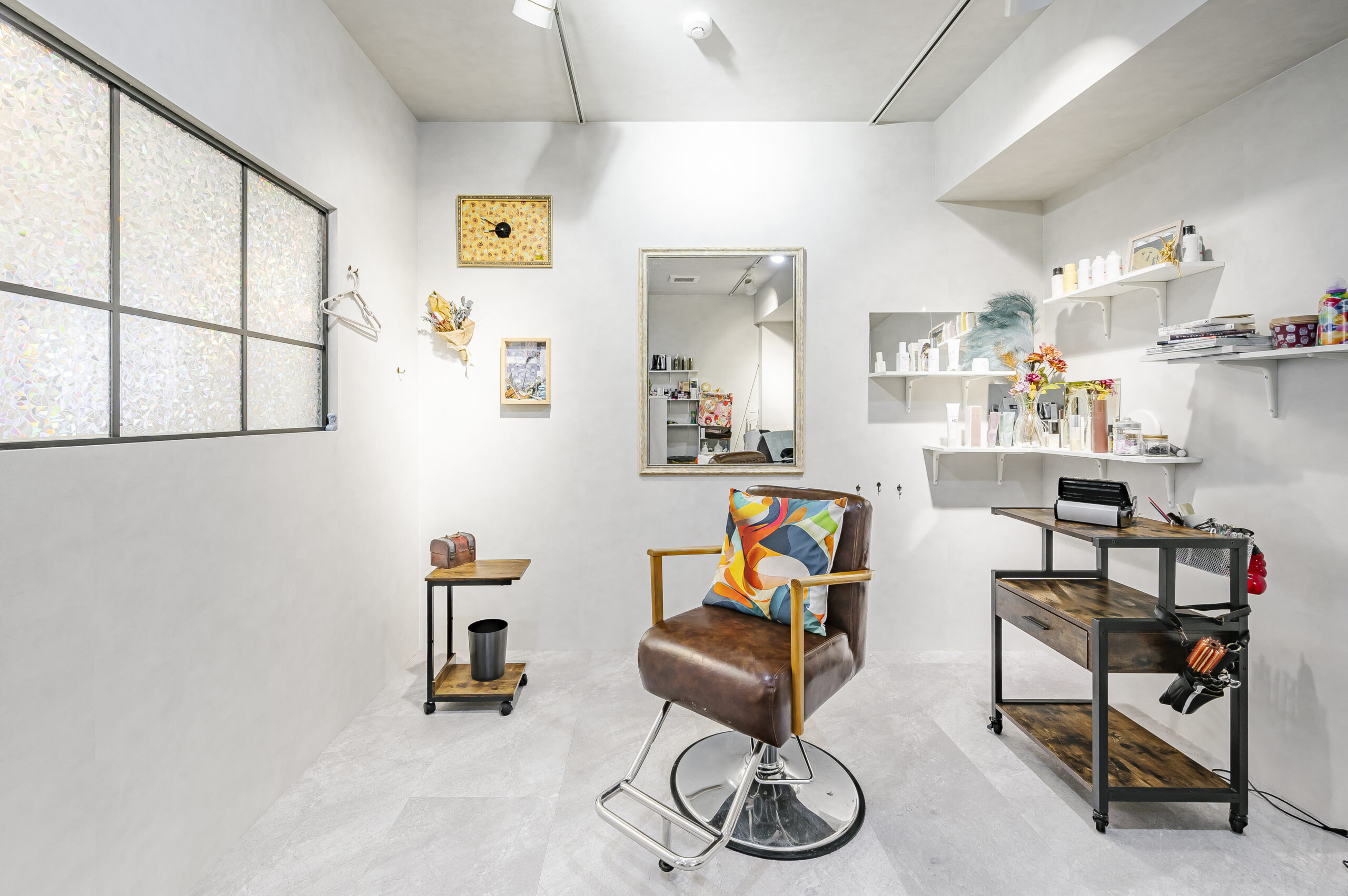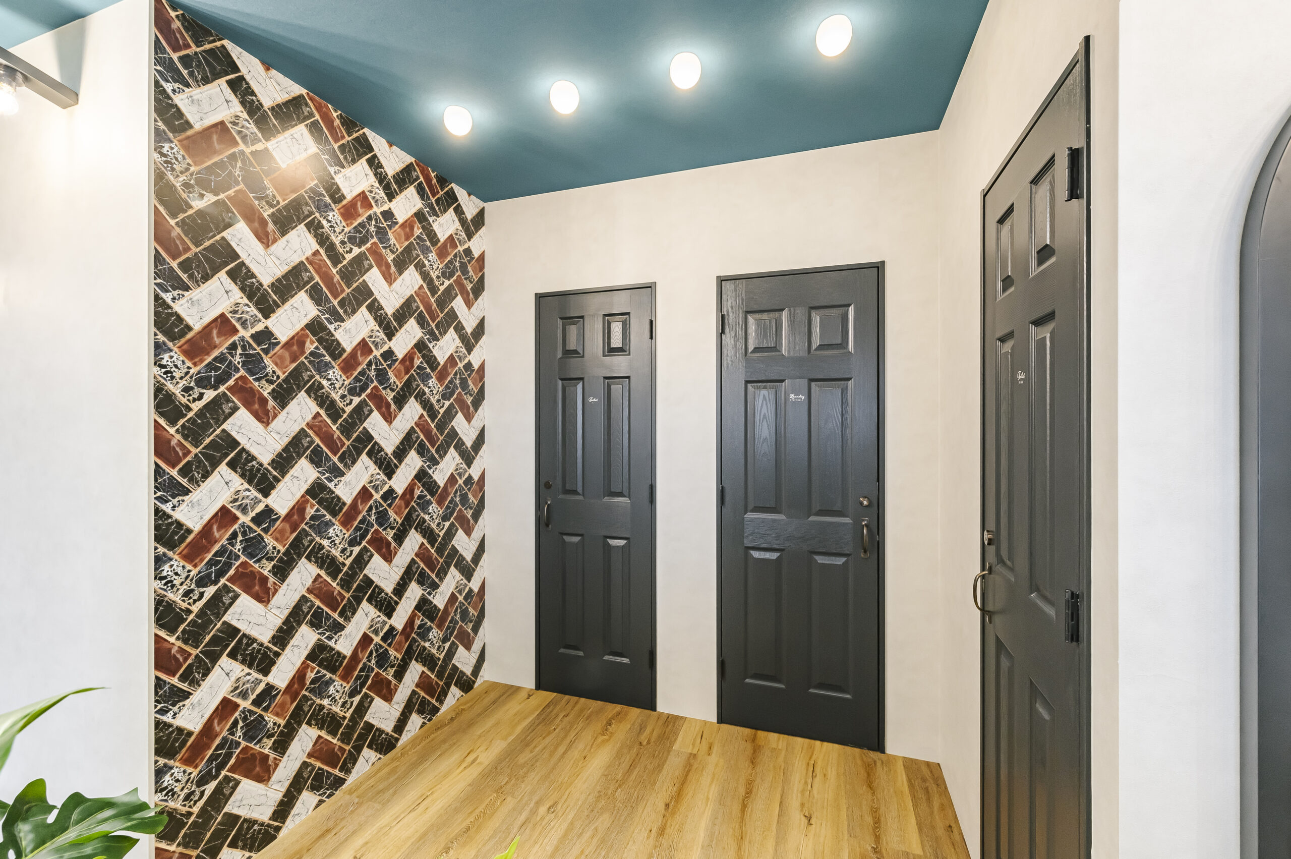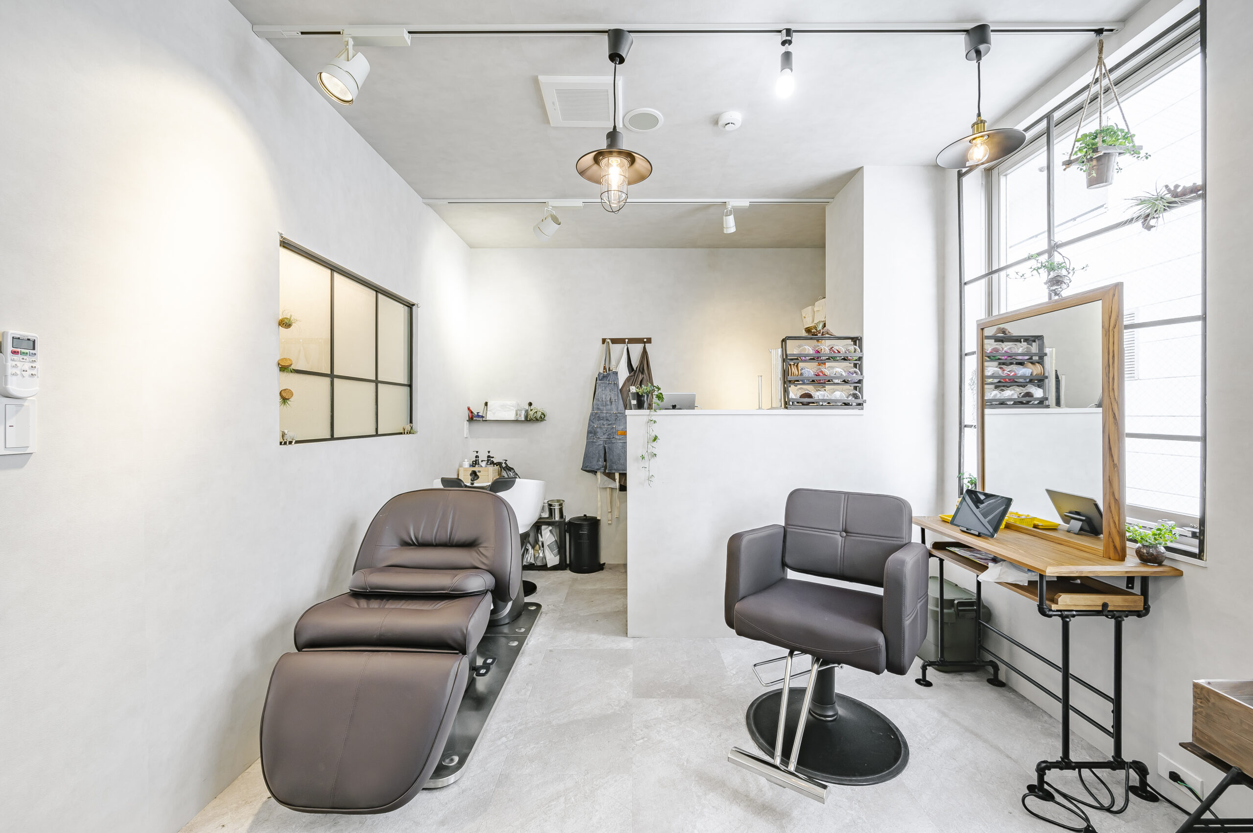 モノトーンで構成されたNYをイメージしたトータルビューティーのオーナーズサロン。 エントランスは大柄のゴシックパターンの床と可愛いロゴのモダンな空間。 屋外をイメージしたブルーの天井は店内奥まで続いており、4本の連続したアーチ照明により リズミカルで開放感のあるアプローチになっている。 中央に配置したランドリーとトイレはどの部屋からもアクセスの良いレイアウト。