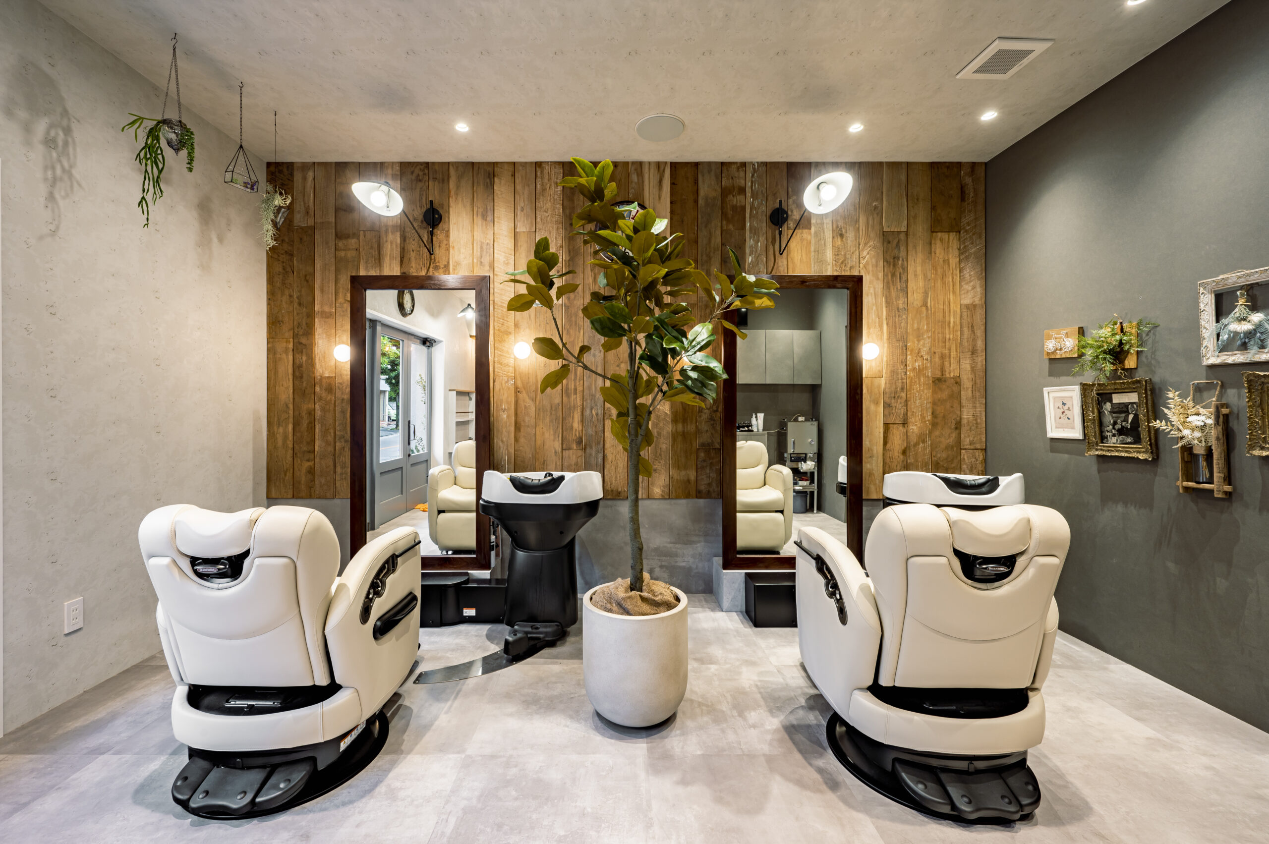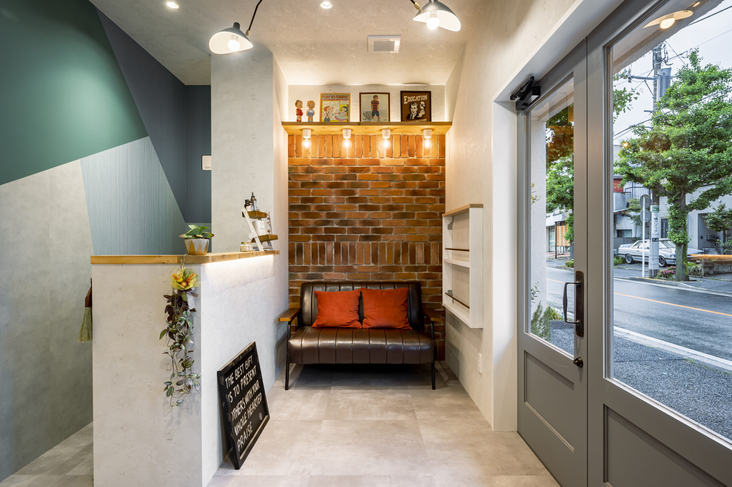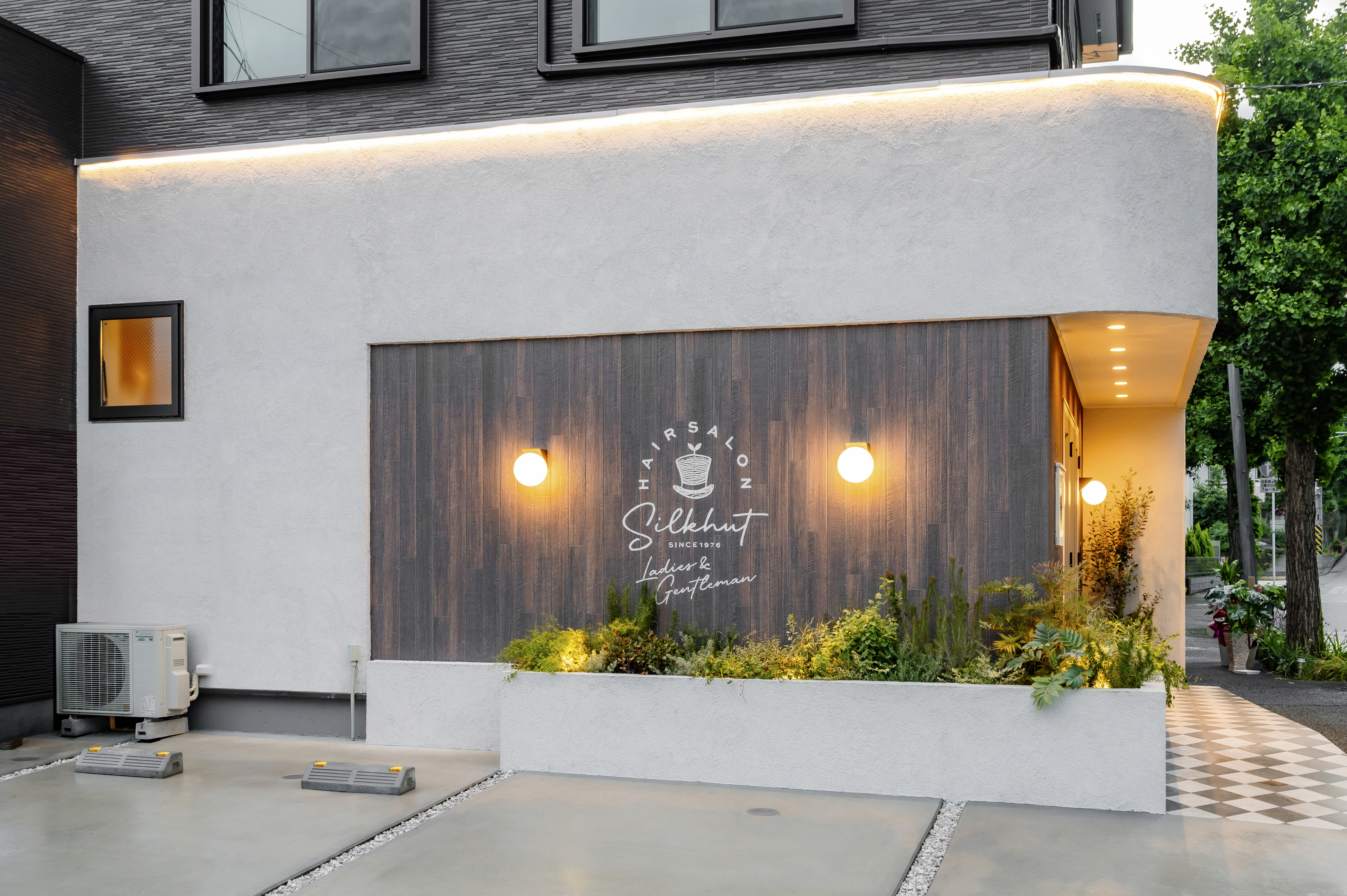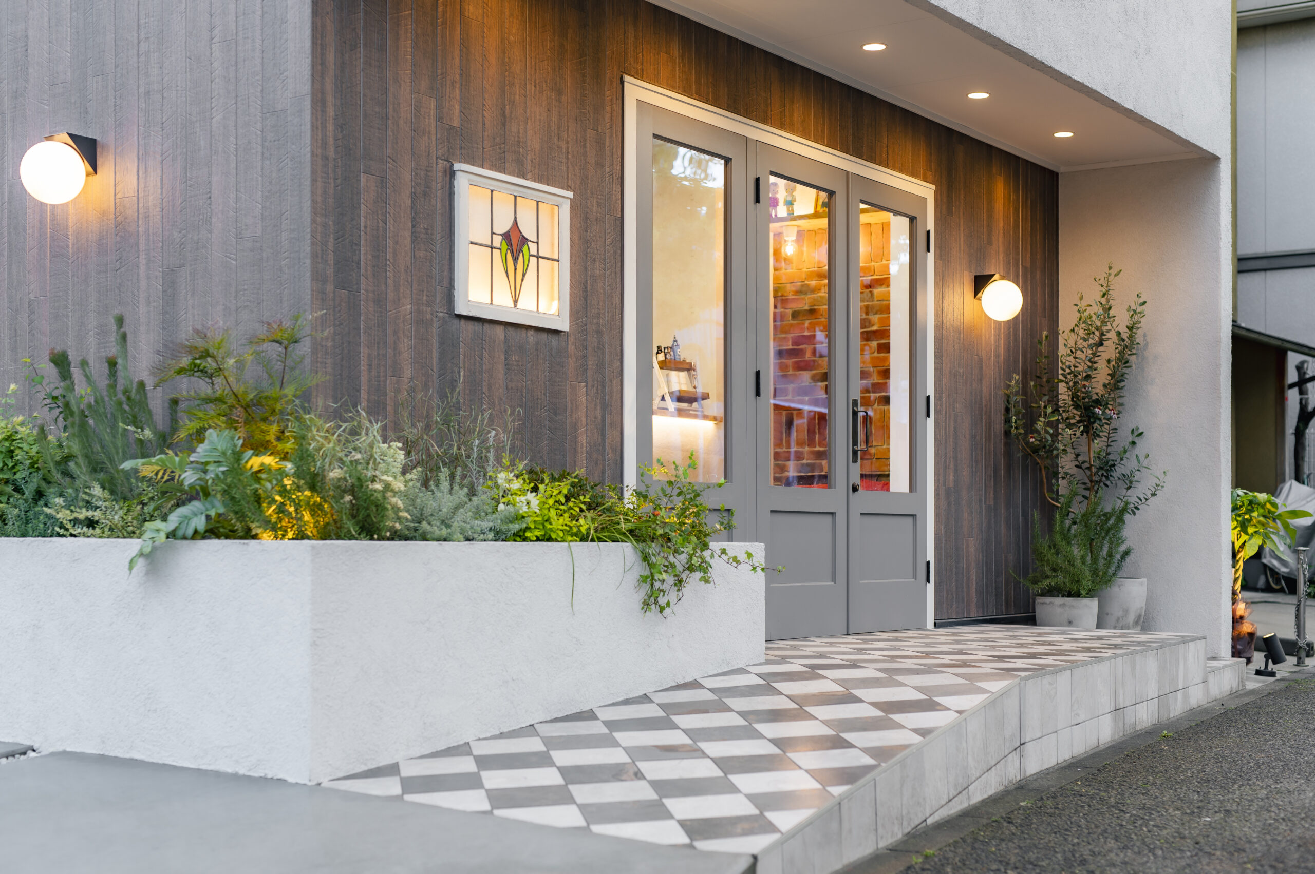 老舗サロンの新築プロジェクト。アンティークの要素を取り入れたモダンなデザイン。斜めチェック柄の印象的な床スロープは期待感を高めるワクワクするアプローチ。程よく店内が感じられる3連建具と温かみのあるwoodwallをバランスよく配置したおしゃれなファサード。シンプルな空間構成の中にポイントで古材を効果的に使用することで、居心地の良いサロンに仕上げた。